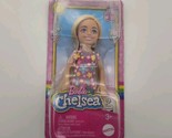 This cheerful Chelsea doll features bright blonde hair, a purple floral dress, and matching yellow shoes ? a fun and colorful addition to any Barbie lineup.