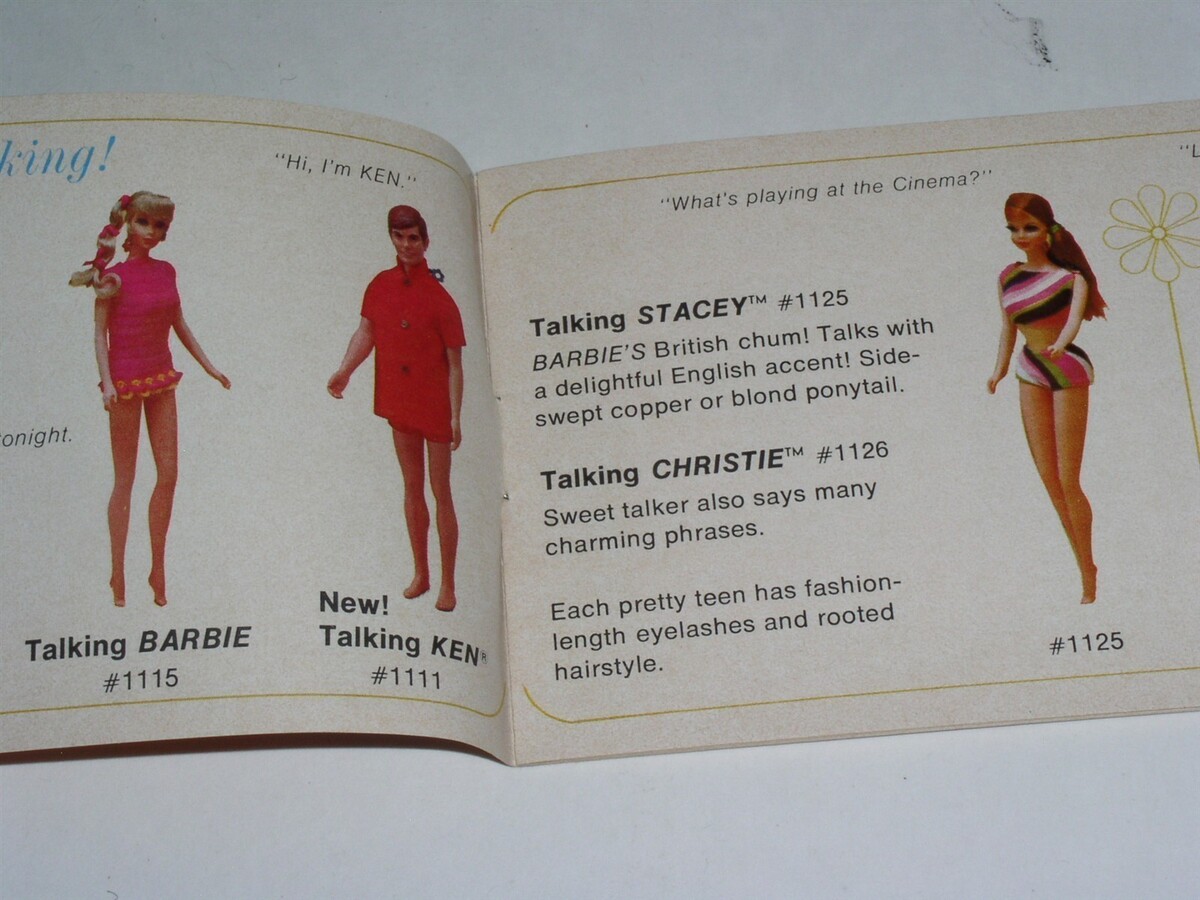 This is an original, vintage Barbie doll fashion catalog entitled, "The World Of Barbie Fashions Book One". Inside: Talking Barbie, Talking Ken, Talking Stacey, Talking Christie, Julia, Francie, Casey, Skipper.