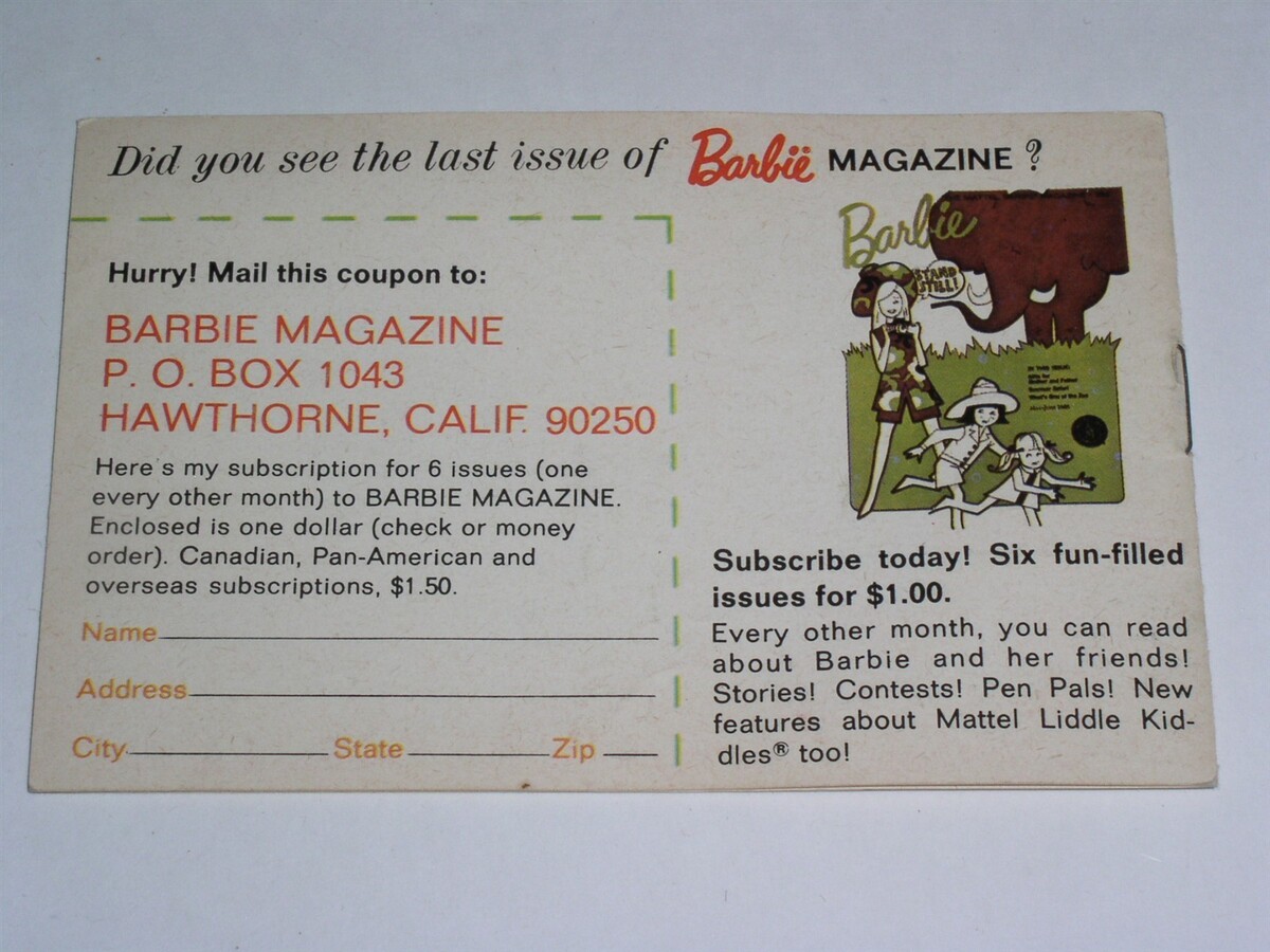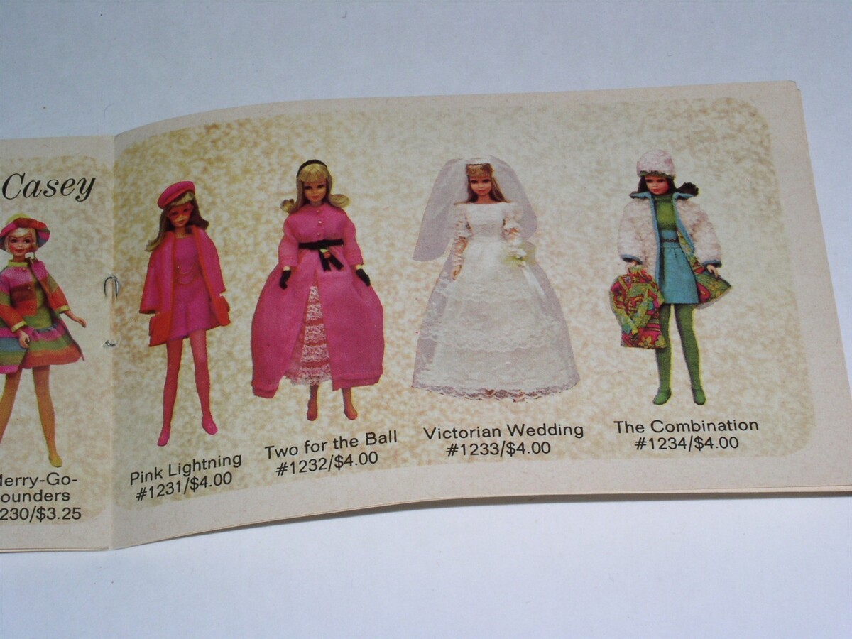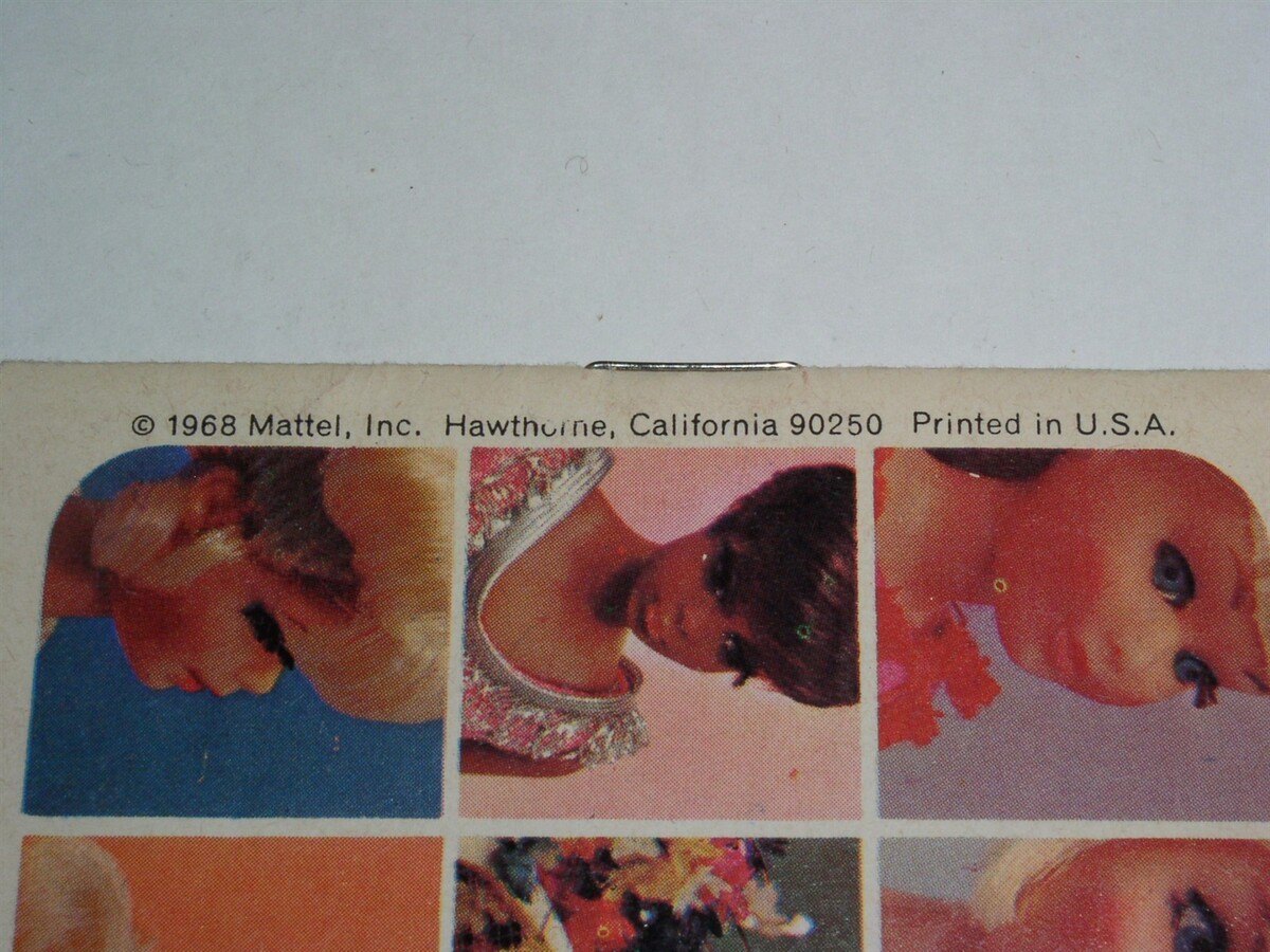Measures 4 1/2" X 3". Dated 1968 by Mattel. 14 very nostalgic color pages of fashions and accessories for Barbie and others, with a picture of the most sought after, "Julia". A terrific item for the collector.