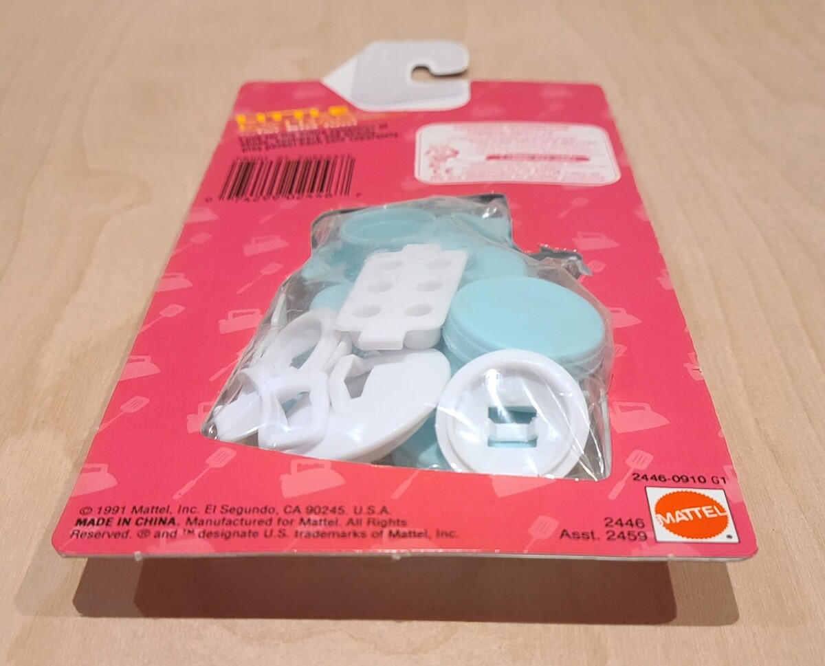 The Barbie Fashion Little Extras Colorful Cookware Aqua White Kitchen Utensils 2446 is a vintage collectible from Mattel, manufactured in 1991 for Barbie fashion dolls. This plastic cookware set includes utensils in a vibrant aqua and white color scheme, perfect for any occasion. Ideal for adult collectors, this Barbie accessory adds a touch of nostalgia to any doll collection, showcasing the brand's commitment to creating unique and stylish doll clothes and accessories in the 1990s.