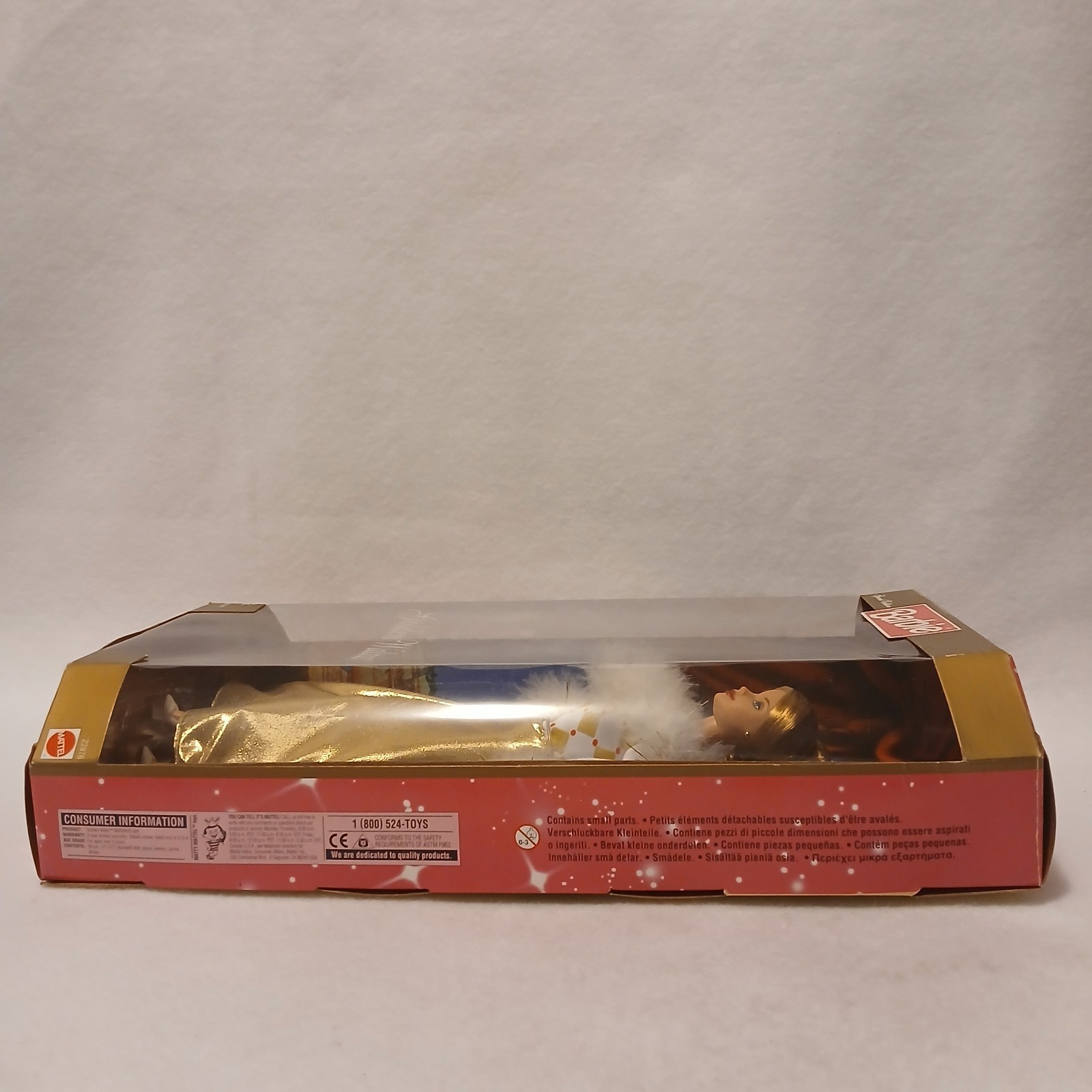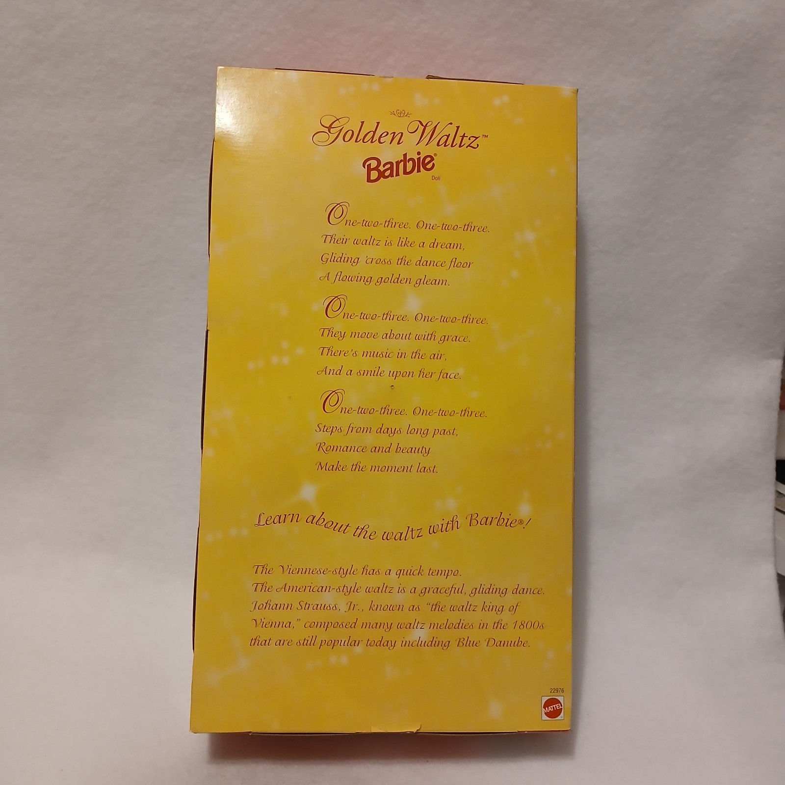 This listing is for a Special Edition Golden Waltz Barbie doll. This doll features Barbie wearing a white and gold dress with fur at the cuffs and neck and has a small gold purse. The doll is like NEW in the original unopened box. The box is clean with minor wear. There is a small tear on the bottom left front corner of the box, see photos. It was made in 1998 and is recommended for ages 3 and older.