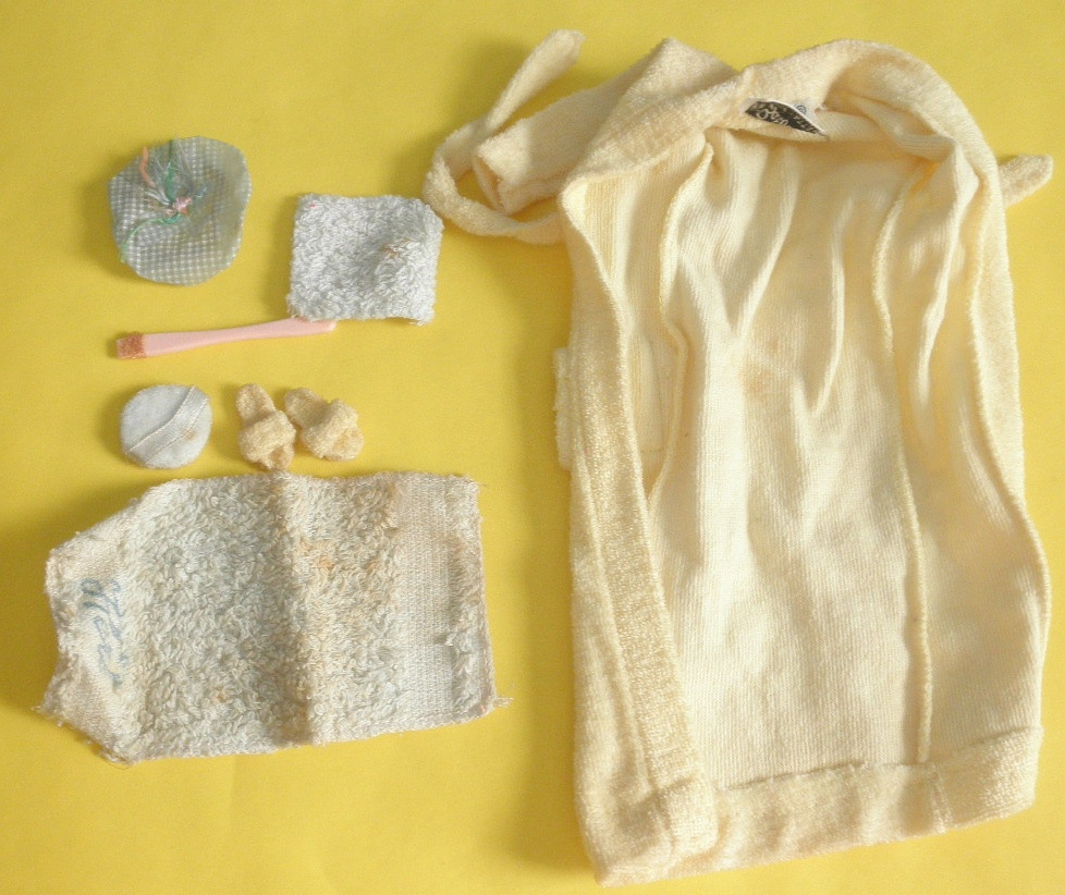 This Barbie robe with accessories comes with slippers, a wash cloth, shower cap, shower brush and small towels. This is a vintage Barbie robe. there is a Barbie Label inside the the robe. This is a complete set. If you have question please e mail me. Have a great Day!