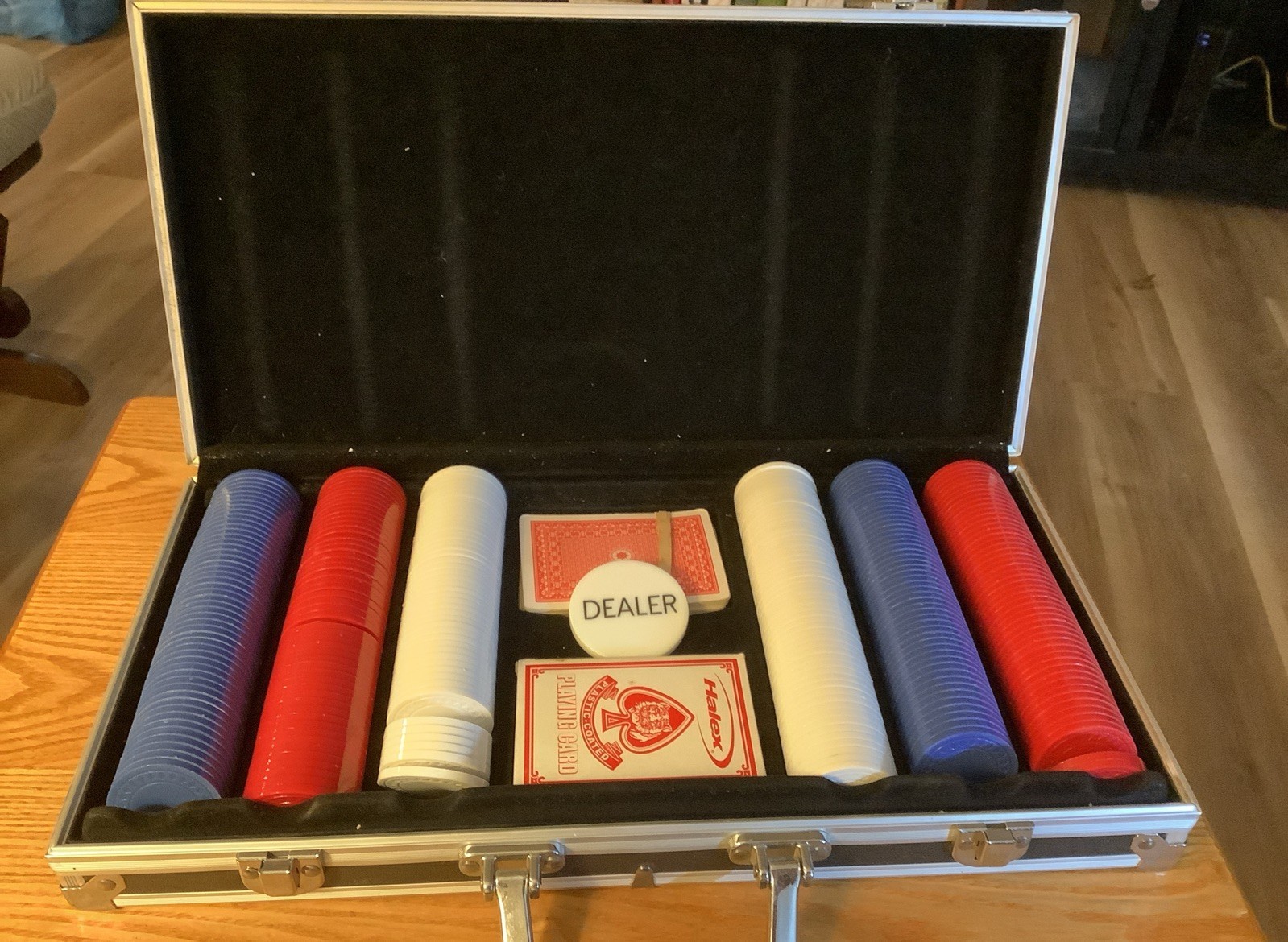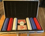 Poker chip set in black plastic and metal carrying case. Approximately 300 red, white and blue chips, 2 sets of cards and a dealer chip. Good condition. Both cards sets are used. Feel free to email with questions. I do combine shipping on multiple items. Have a great day!