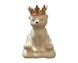 This product is a large, white ceramic and metal soap holder in the shape of a polar bear with a gold crown. It is suitable for hand soap and has a free-standing mounting option. The holder is adorned with glitter and has a holiday and wild animal theme. It is branded by Bath Body Works and was made in China.