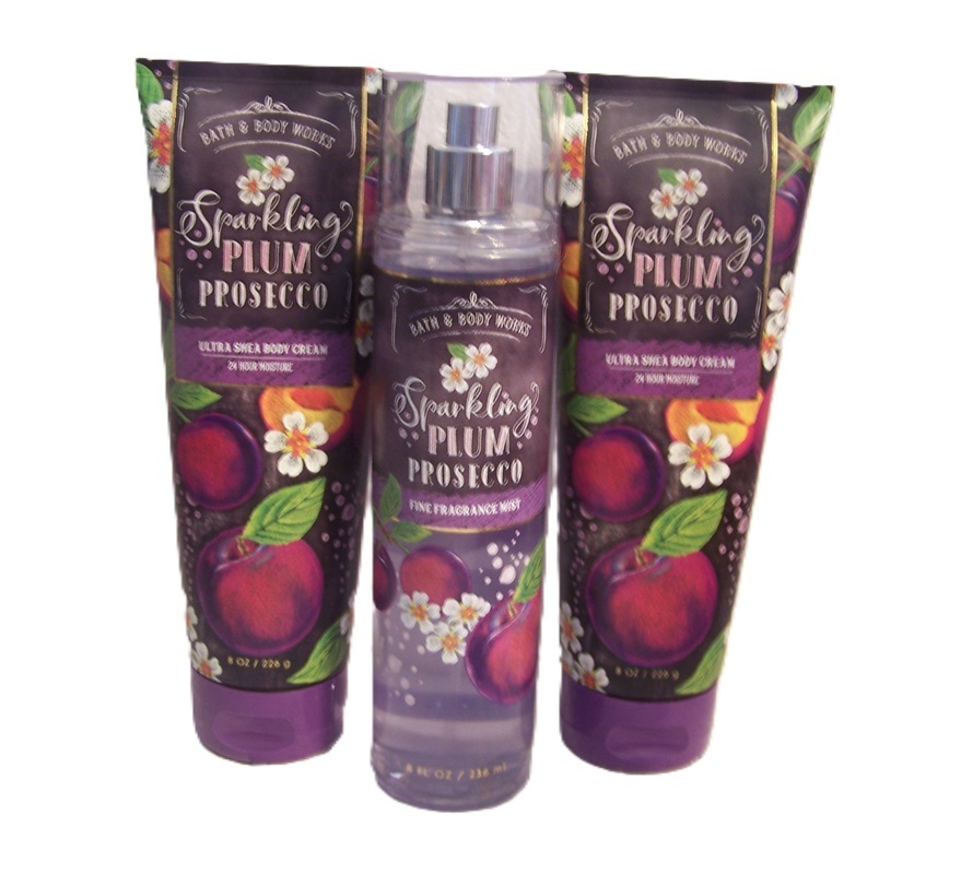 3 Piece Bath Body Works Sparkling Plum Prosecco Fragrance Set - Fine Fragrance Mist Ultra Shea Body Cream 8 oz each - New