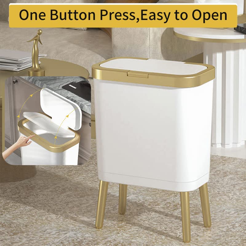 Bathroom Trash Can with Lid, Plastic Garbage Can with Legs, 4 Gallon Gold Trash Bin with Push Button, Narrow White Trash Can Waste Basket for Bedroom, Living Room,Office, Dog Proof Trash Bin