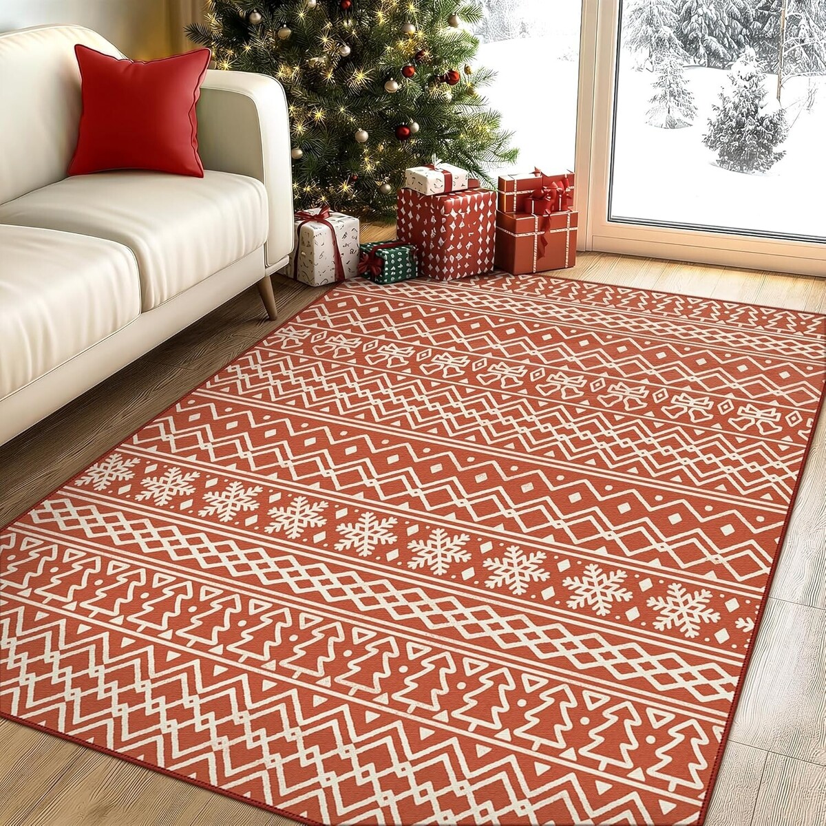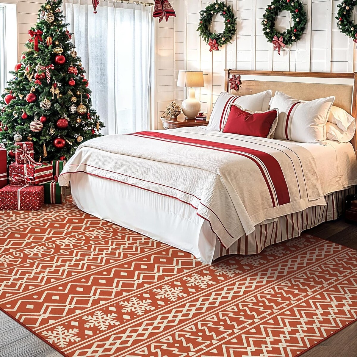 Bavni Holiday Christmas Area Rug Washable 8'x10' Fireplace Living Room Red