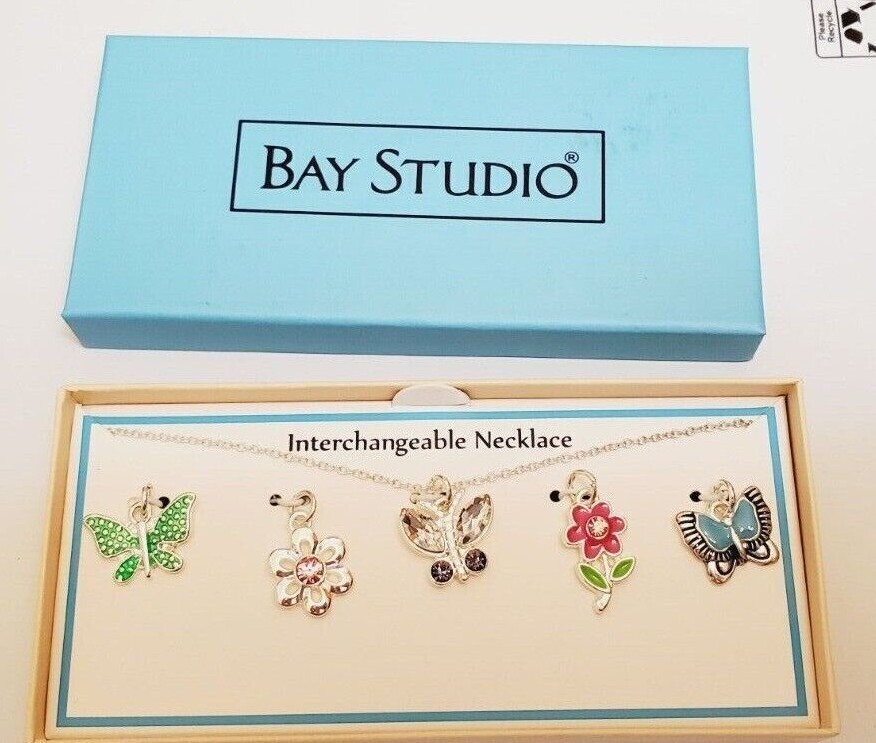 Bay Studio boxed interchangeable necklace with 5 pendants. New in box. Necklace is 17.5 inches long with a 2.5 inch extension. Lobster clasp. Pendants are .75 to 1 inch. Not intended for children under 12 due to choking hazard.