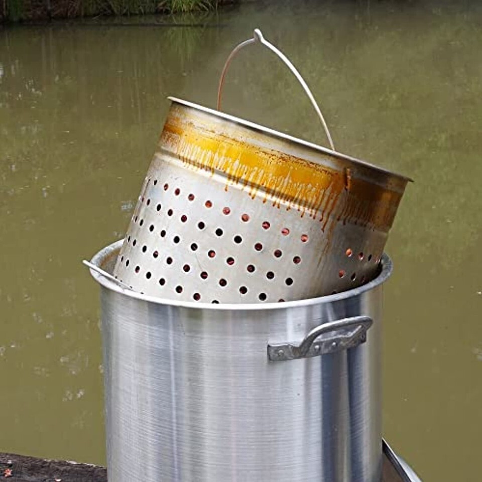 Bayou Classic 1000 Handcrafted 100-qt Aluminum Bayou Boiler Features Heavy-Duty Riveted Handles Reinforced Boiling Basket w/ Helper Handle Made w/ Heavy Gauge Aluminum