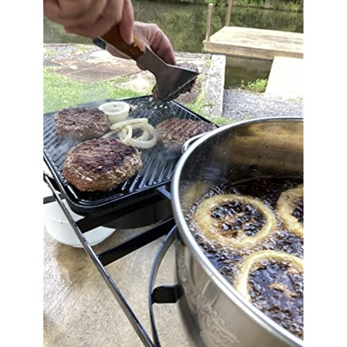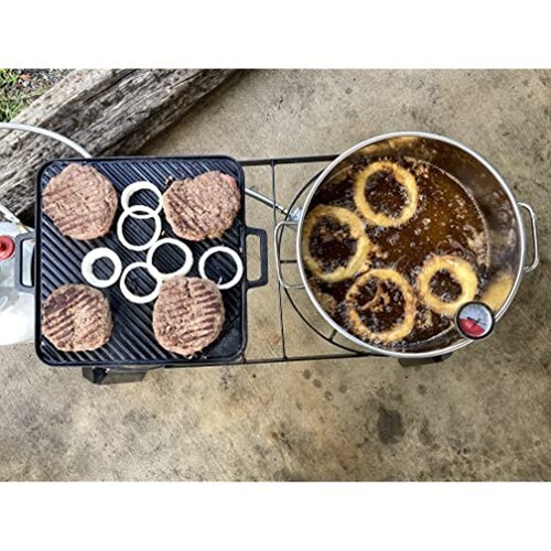 Bayou Classic DB250 Dual Burner High Pressure Cooker Features 12.5-in Tall Welded Steel Frame Dual 14-in Cooking Surfaces Dual 4-in Burners Dual 36-in Stainless Braided Hoses