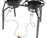 -- This outdoor cook stove enables grilling aficionados to slap their meat on the barbecue while simmering their basting sauce and accompanying pot of spicy beans right nearby. The stove also travels well and can be towed along to a campsite to make hearty ham-and-egg breakfast sandwiches in the morning or a tailgate party to serve up turkey chili. Equipped with a 31-1/2-inch cooking surface and two 14-inch-diameter gas burners, this outdoor stove can accommodate two stockpots up to 60 quarts in size. Two brass valves control the heat on each burner individually and adjust precisely to the appropriate gas flow for either a low flame for simmering or the highest temperature for frying. The stove's heavy-duty welded steel frame is hefty enough to support oversized pots or cast iron cookware and stands 13 inches tall on its own. The included extension legs raise the cook surface up 25 inches from the ground, which is a fairly comfortable level for people of average height. Extension legs simply slide on without requiring bolts or screws so they can be added and removed as necessary. The stove comes with a regulator kit, valve assembly kit, and a 3-foot-long pressure hose, plus full instructions on how to safely connect between the LP gas cylinder and the cooker. A whole host of other safety precautions and detailed instructions on proper placement are also outlined in the manual to ensure an enjoyable outdoor cooking experience. This cooker is covered by a 1-year warranty. --Cristina Vaamonde Product Description Barbour gas cooker, dual burner, high pressure, cast iron, barbour, series: Bayou classic, 100000 BTU, LPG fuel, 31-1/2 in overall width, 13 in overall depth, includes: 25 in Extension legs, dual 36 in stainless braided hoses 10 PSI regulator, for large batch cooking, outdoor camping, tailgating beer brewing.