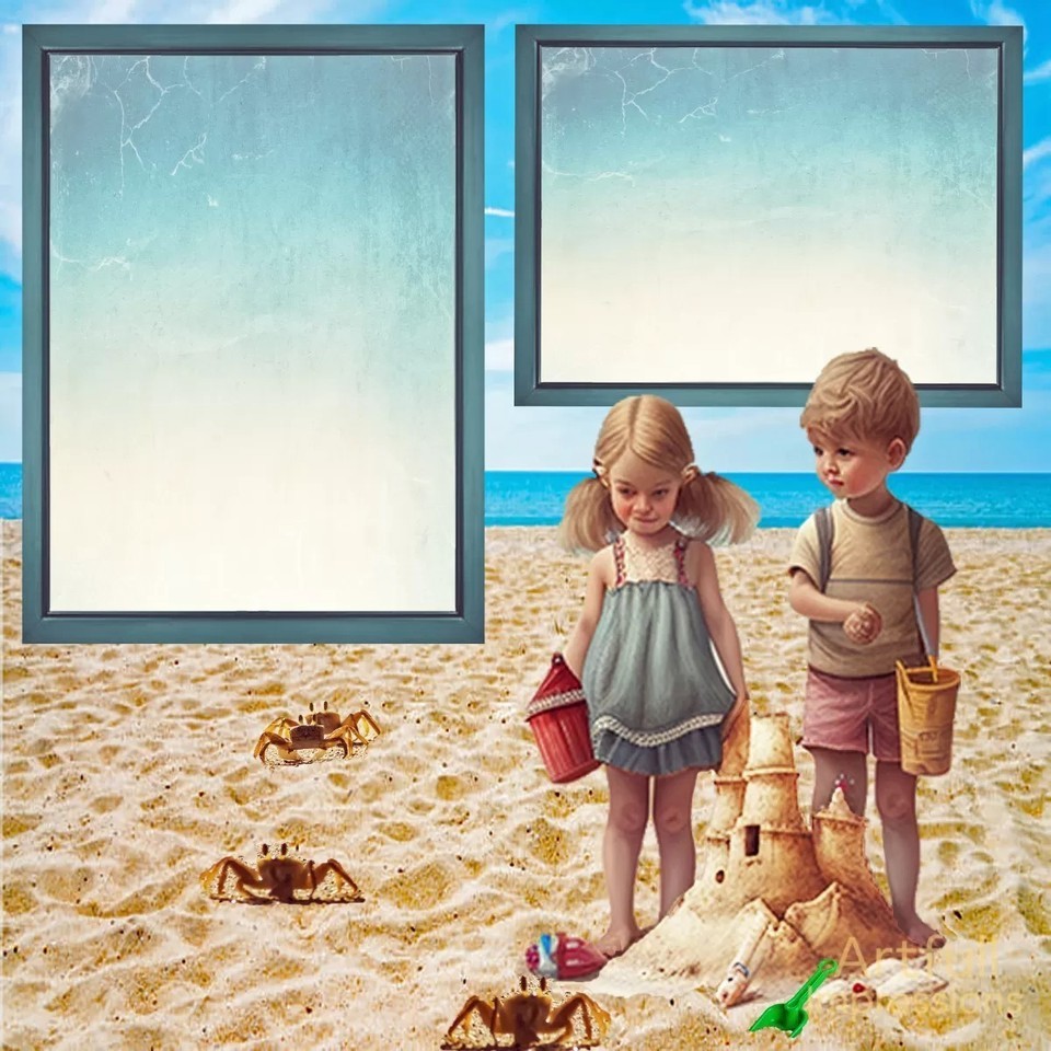 two vintage-style children building a sandcastle?complete with playful crabs