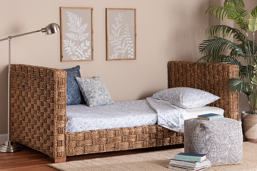 Embrace the relaxing nature of rustic design with the stunning April daybed. Made in Indonesia, this bohemian piece consists of a sturdy wood frame embellished in woven seagrass. The bold, raised ends and low-profile sides showcase an intricately created basketweave design to highlight the natural texture of the seagrass from every angle. The April requires assembly and utilizes wood slats for mattress support, eliminating the need for a box spring. Delivering the raw beauty of nature in soothing character, the April daybed is a serene addition.