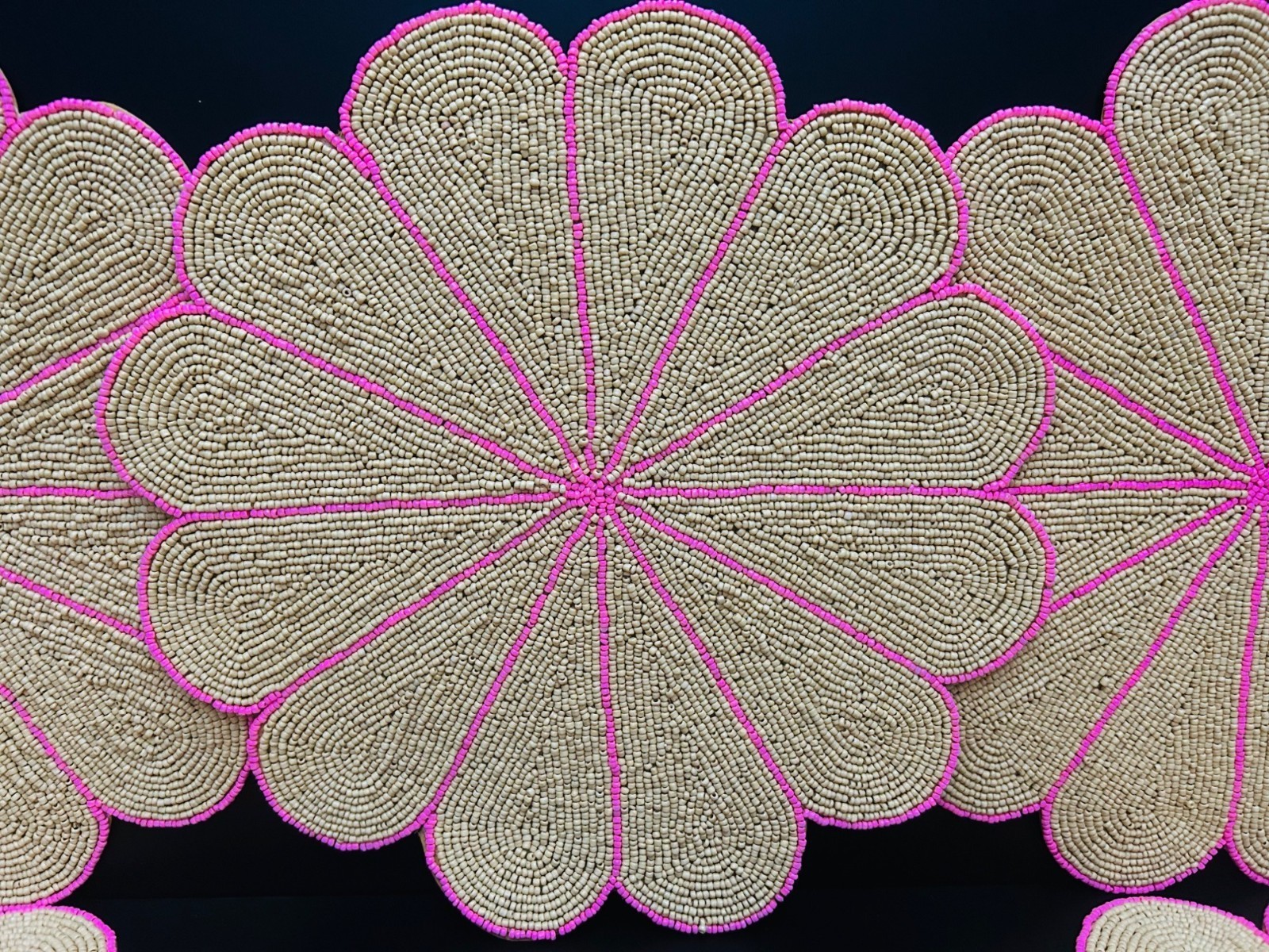 Enhance your dining table with these exquisite handmade floral placemats. Their intricate beaded design and vibrant pink accents create a charming and inviting ambiance.
