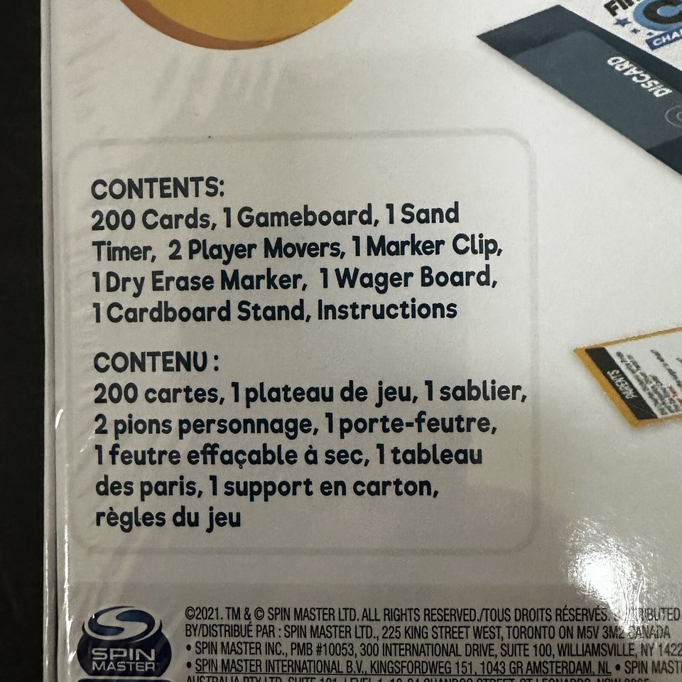 Includes 200 trivia and challenge cards, 1 gameboard, 1 sand time, 2 player movers, 1 dry erase marker with clip, 1 wager board with stand and instructions.