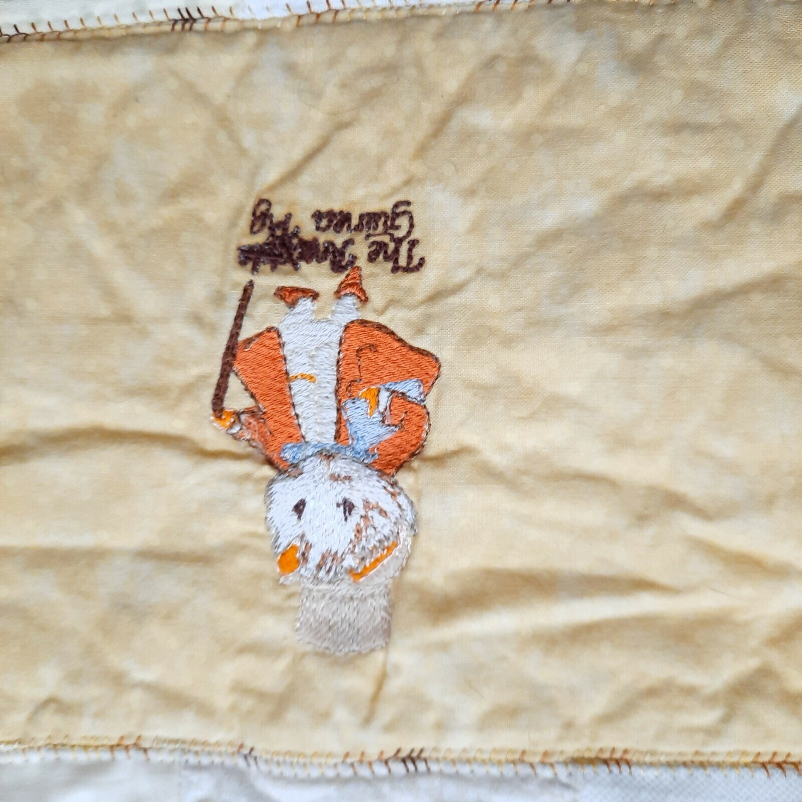 Handmade and machine embroidered. Was used for room decor only. Would be great for decor and would look lovely over a chair or hung on the wall. Excellent condition.