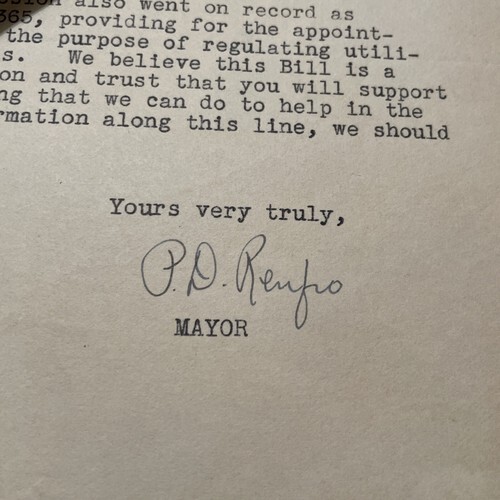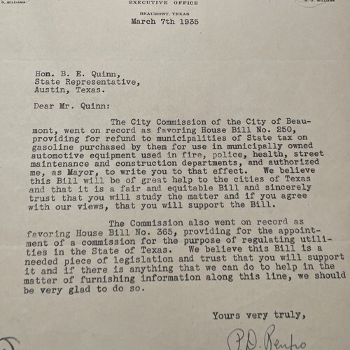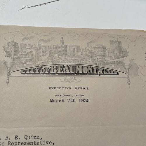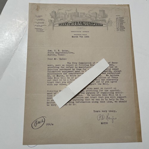 - Beaumont Texas Mayor P. D. Renfro 1935 Antique Letter City Of