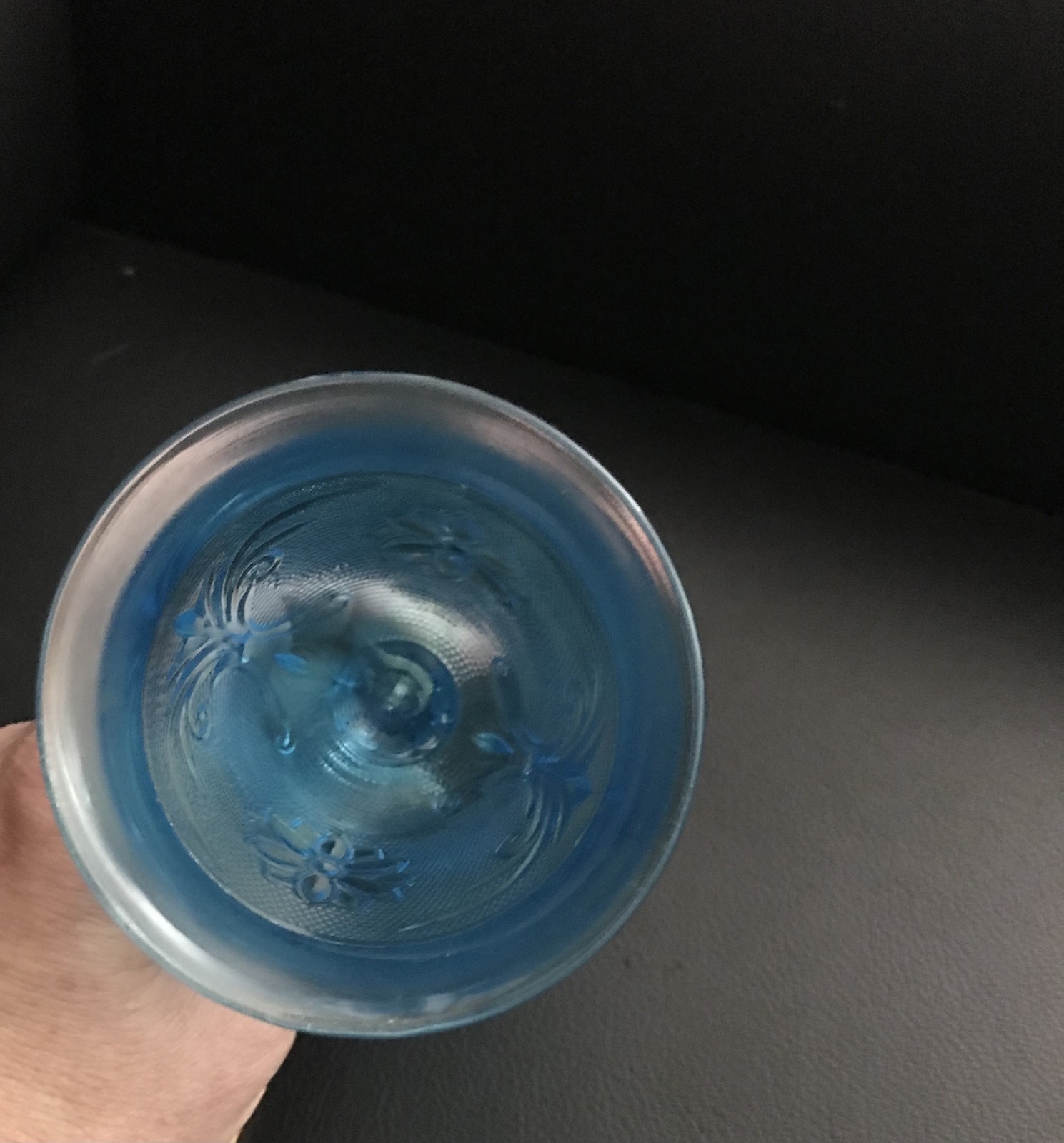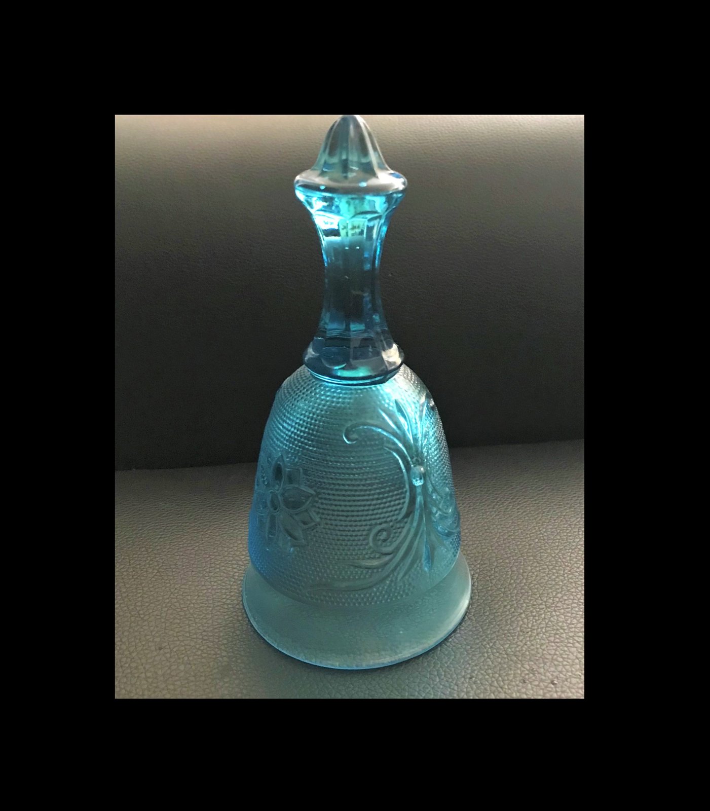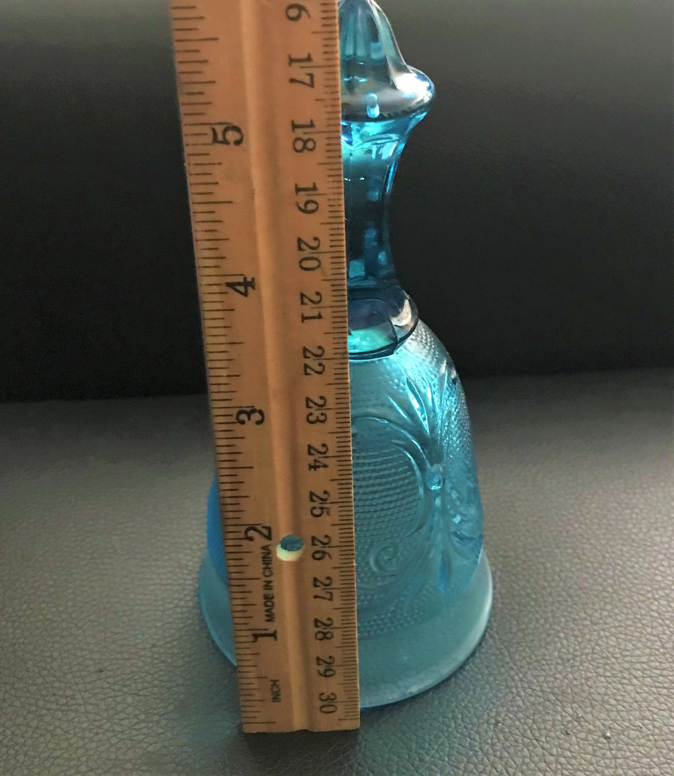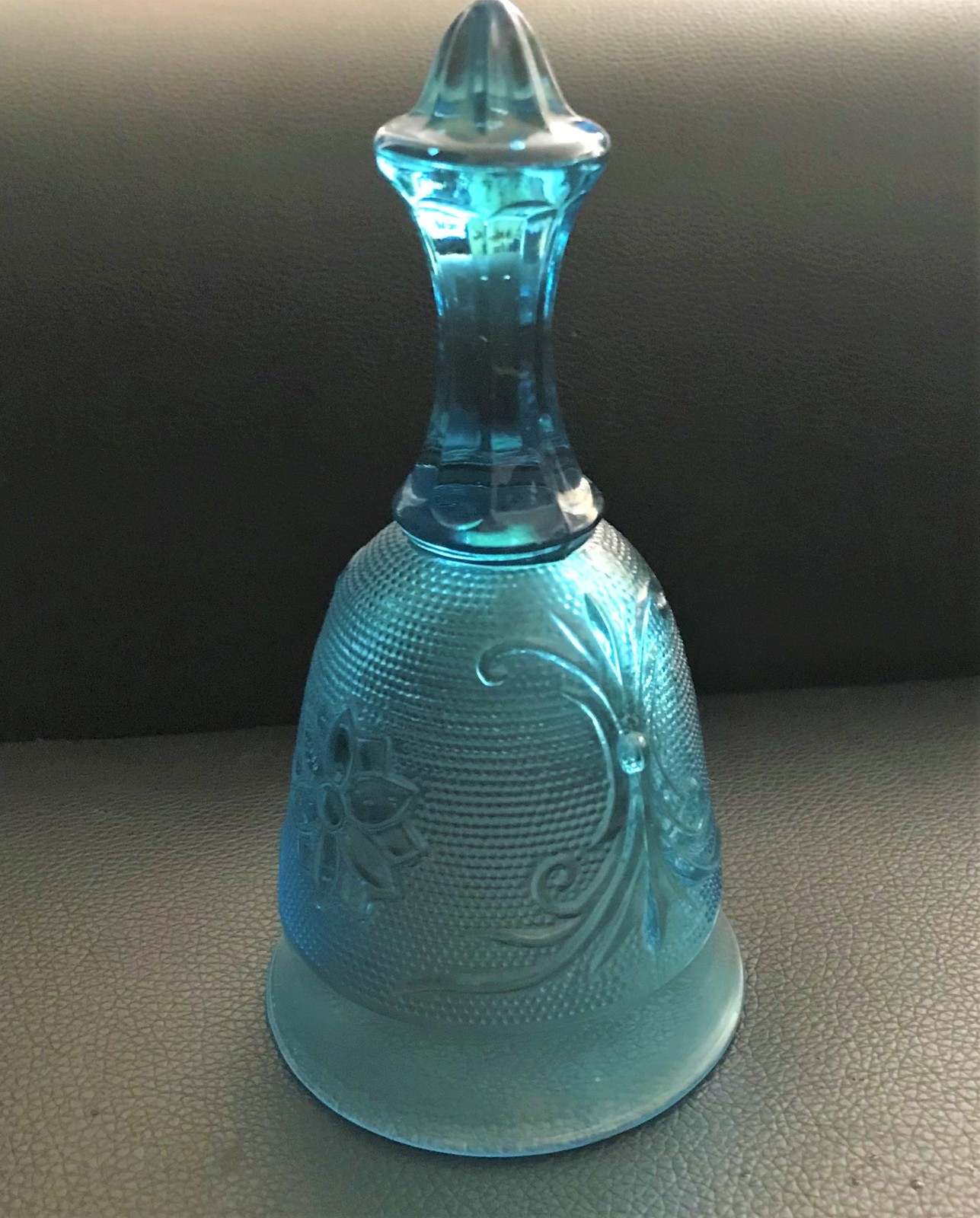 This beautiful blue bell shaped pressed glass does not have any kind of ringer/dinger, nor did it ever. It was simply created to be pretty, and we believe that it is. What do you think? As for it's age, we're only guessing the 90's. If somebody recognizes this and would like to educate us, we would welcome your input.