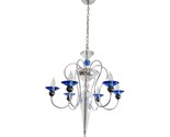 This chandelier is made by Schonbek. It has a silver frame mounted with solid hand cut Swarovski crystal in clear and blue. It has 6 candelabra sockets and is complete with original chain and crystal canopy.