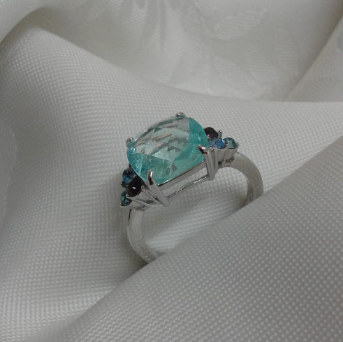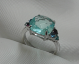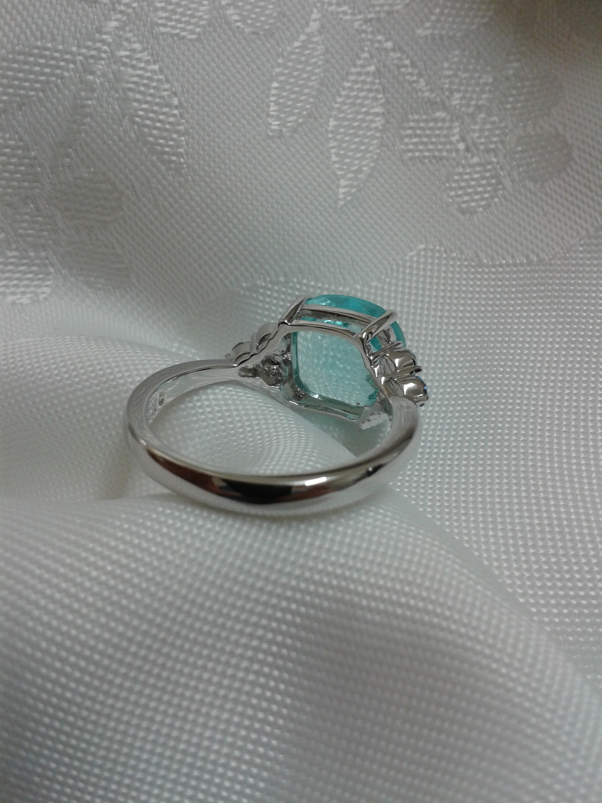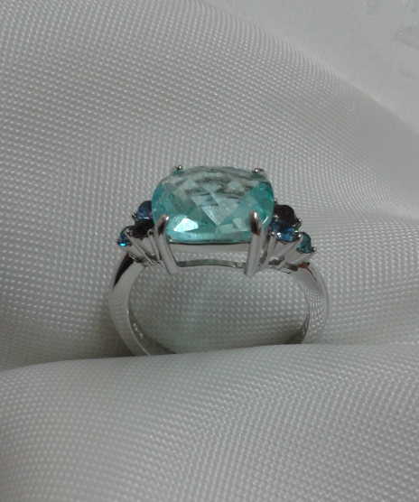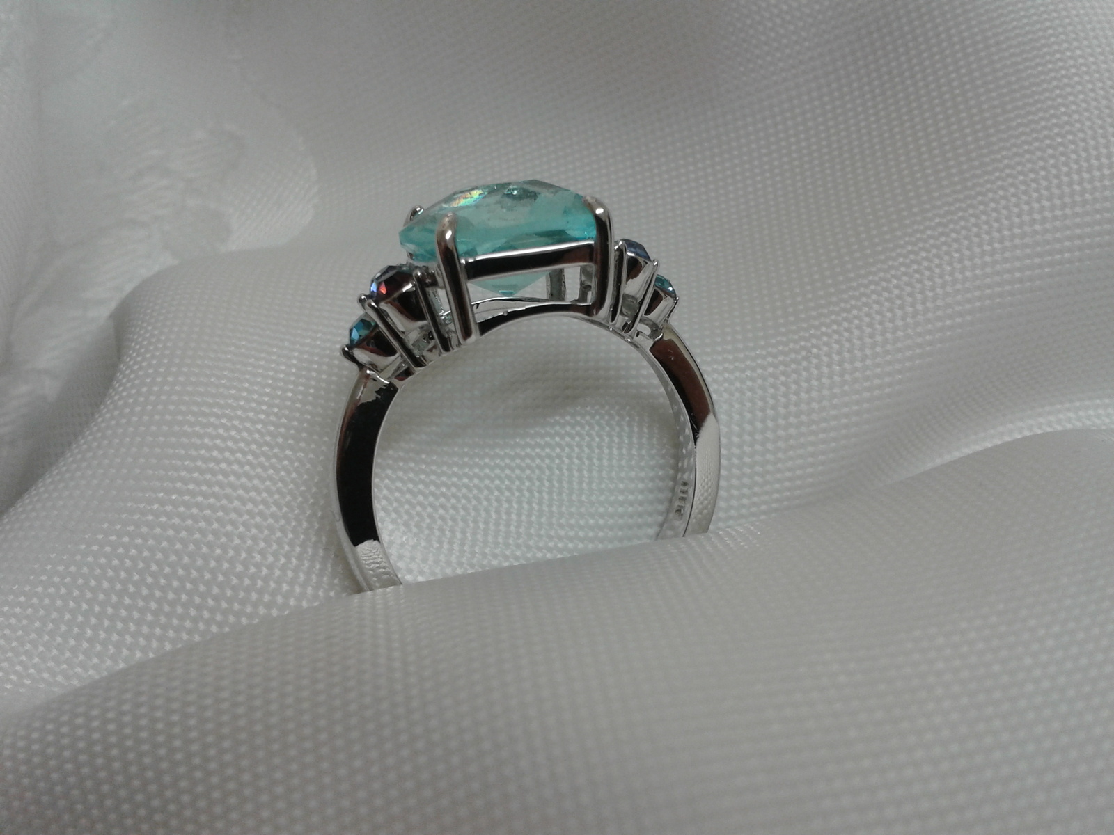 An absolutely stunning silver tone ring set with a gorgeous aqua stone, beautifully cut and complemented with three smaller stones on each side.