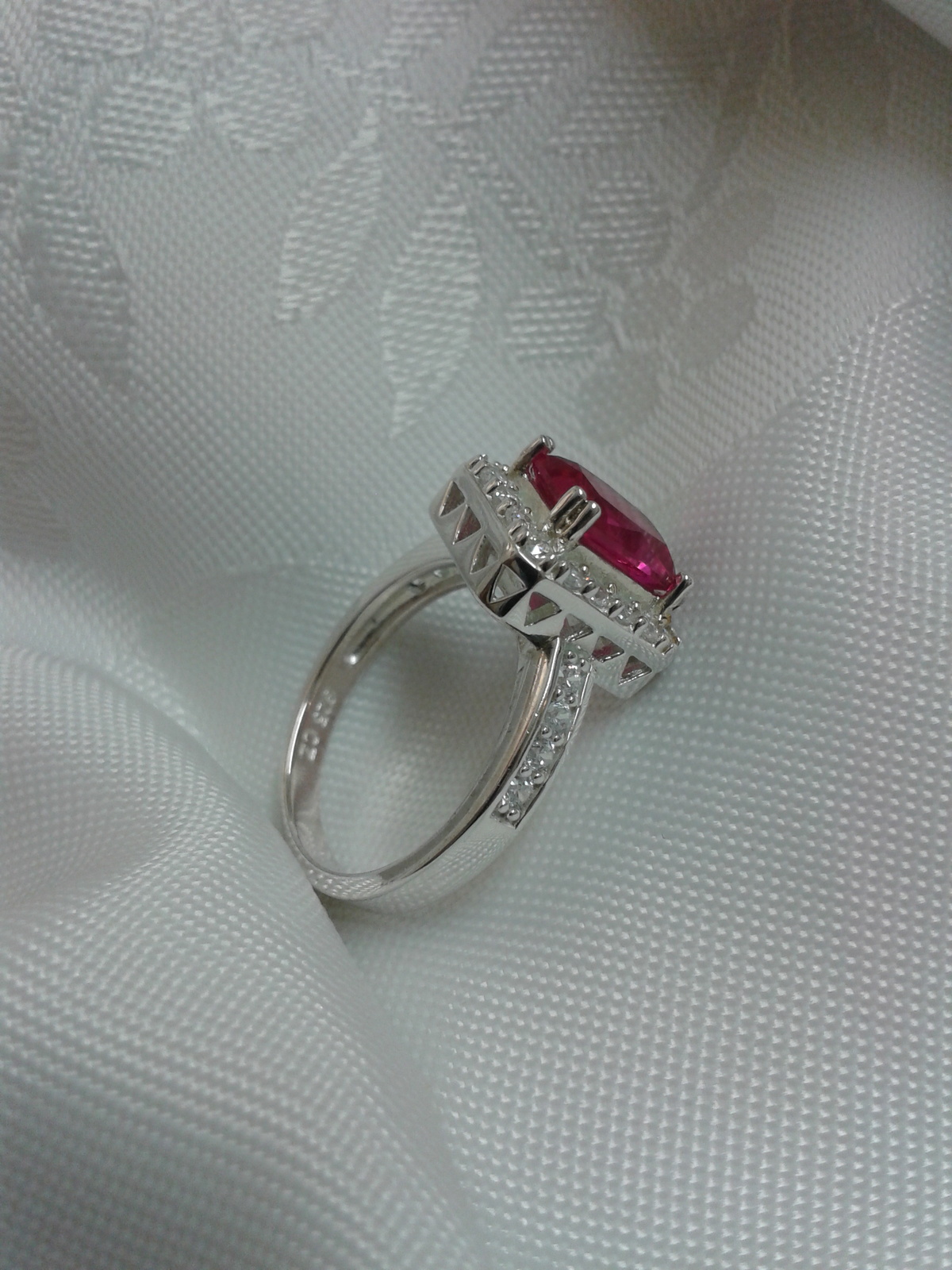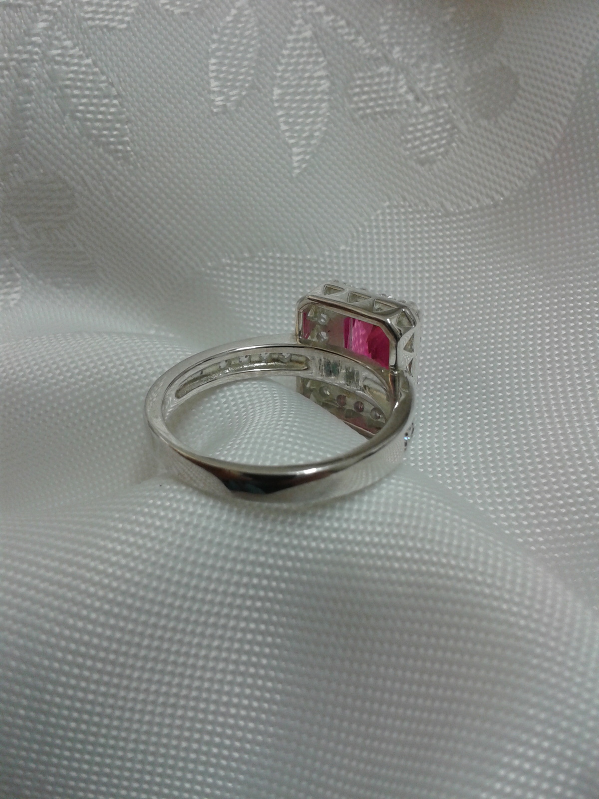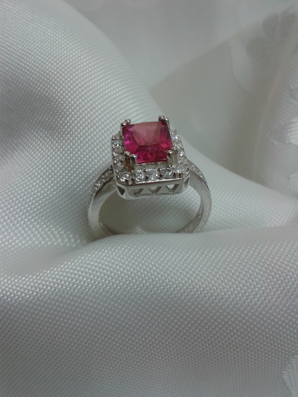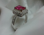 - Beautiful Sterling Silver Ring With Ruby Red Square Stone surrounded By White St