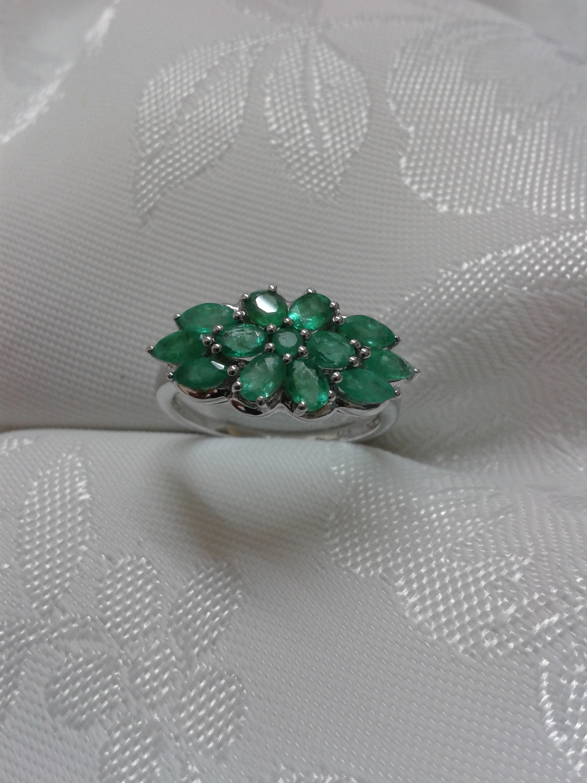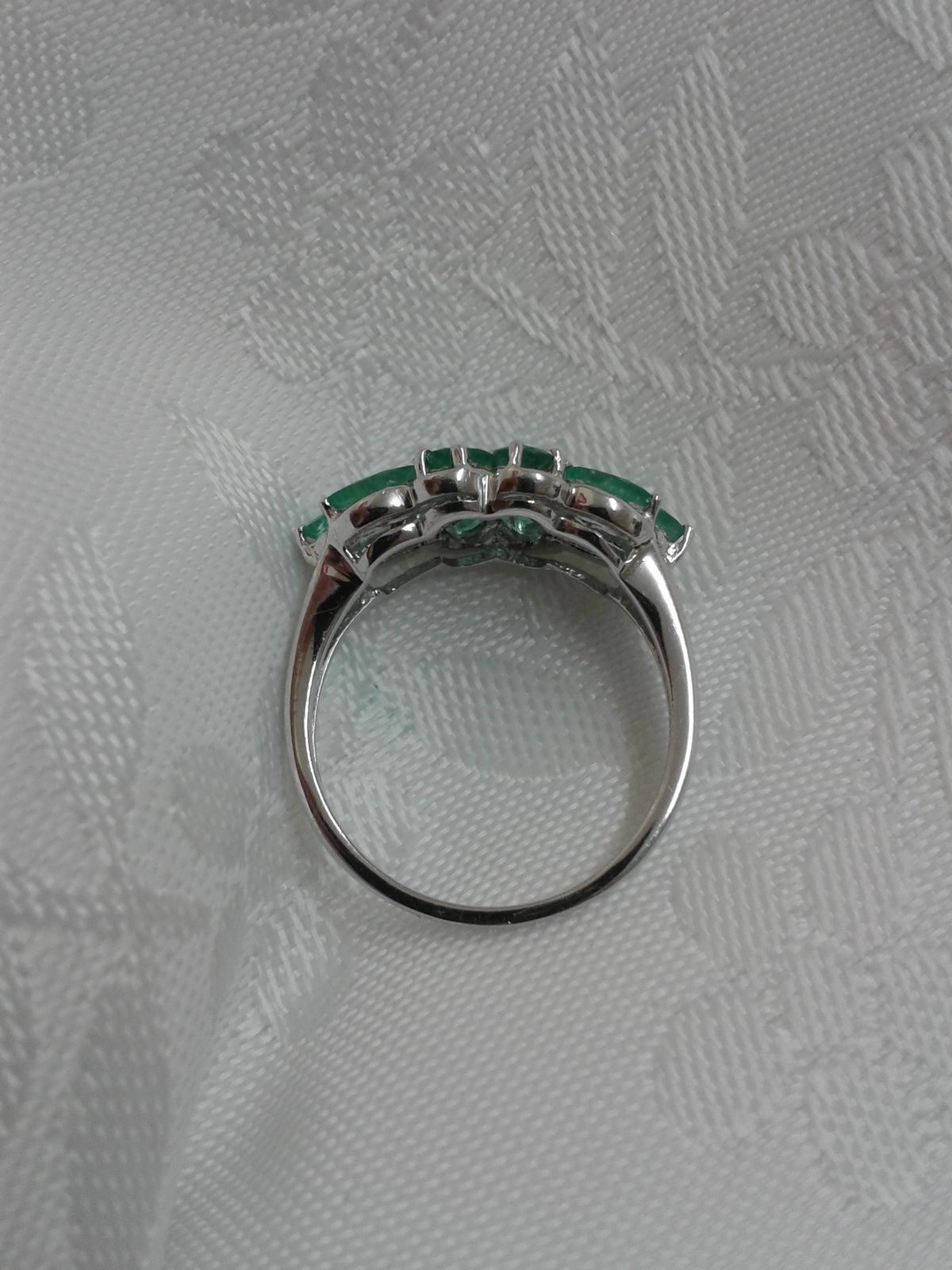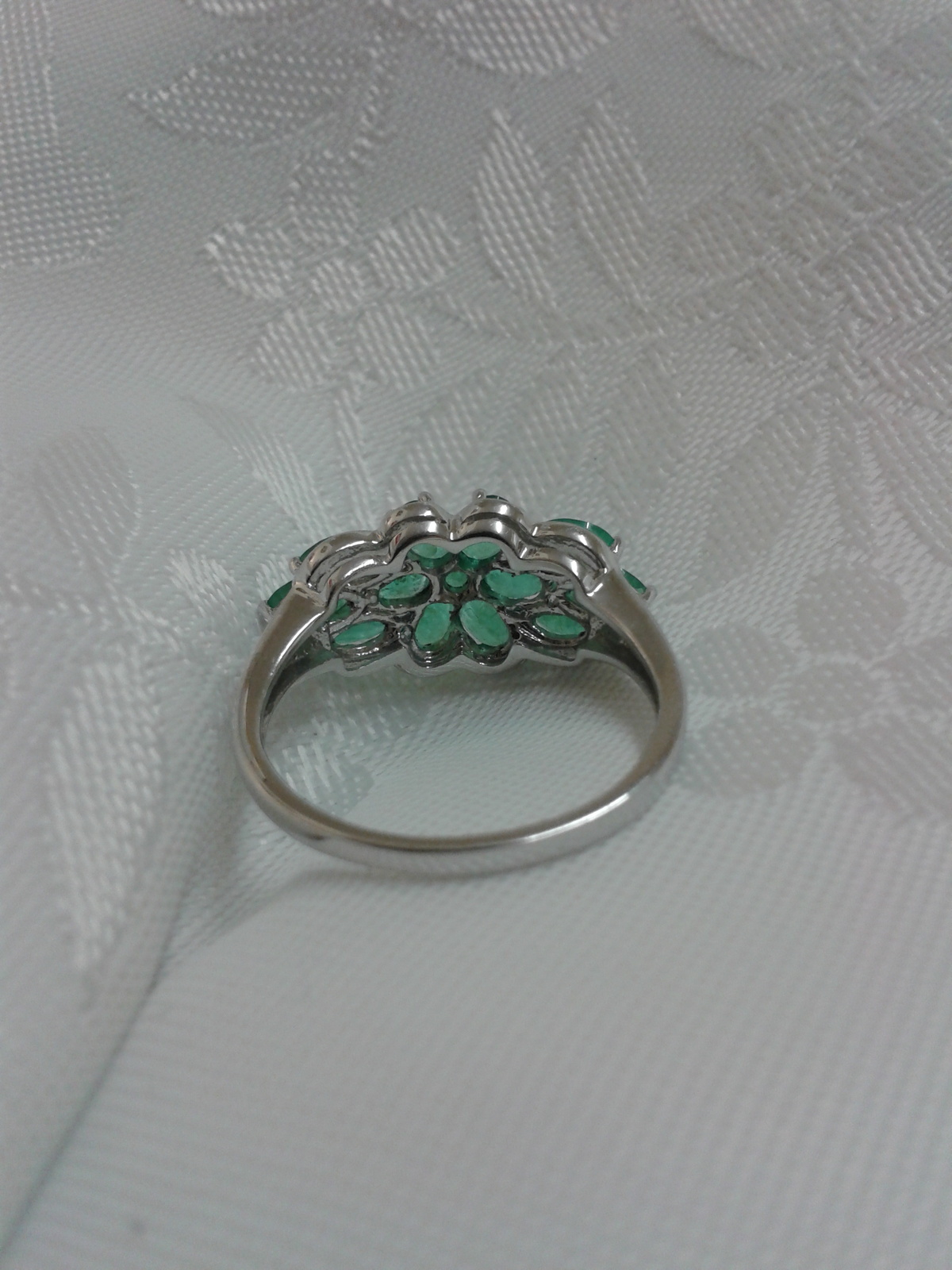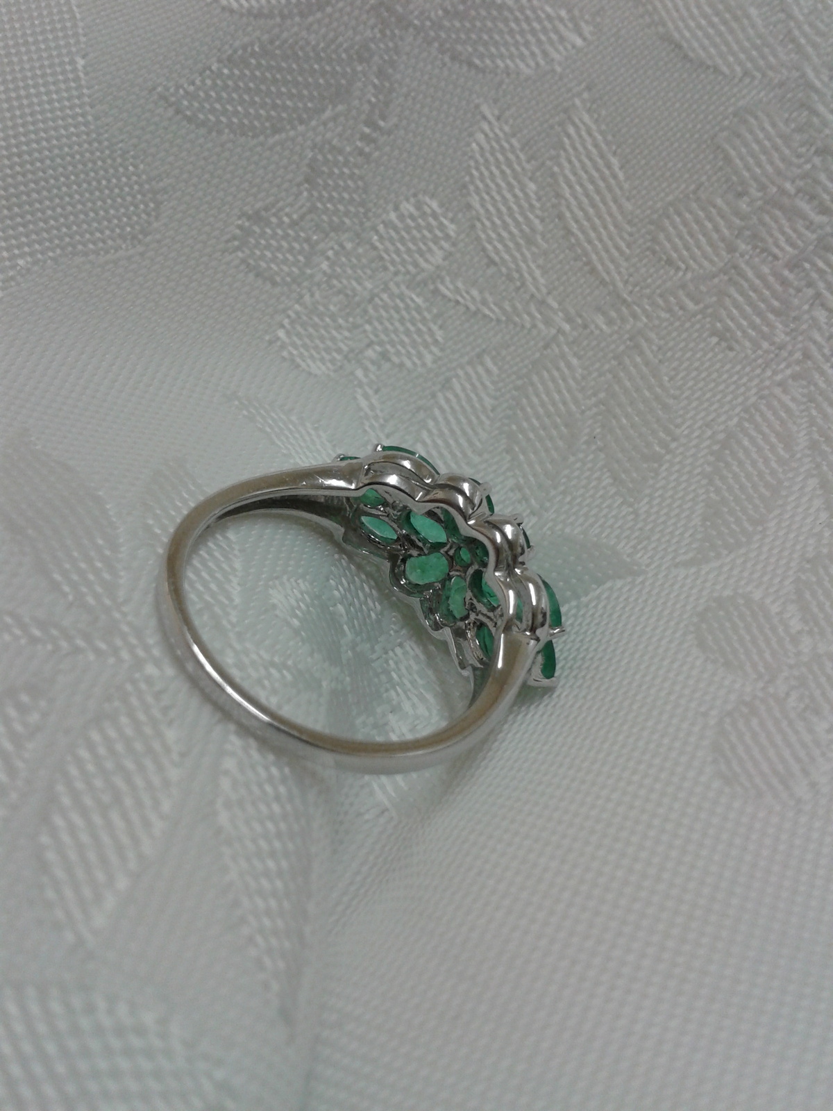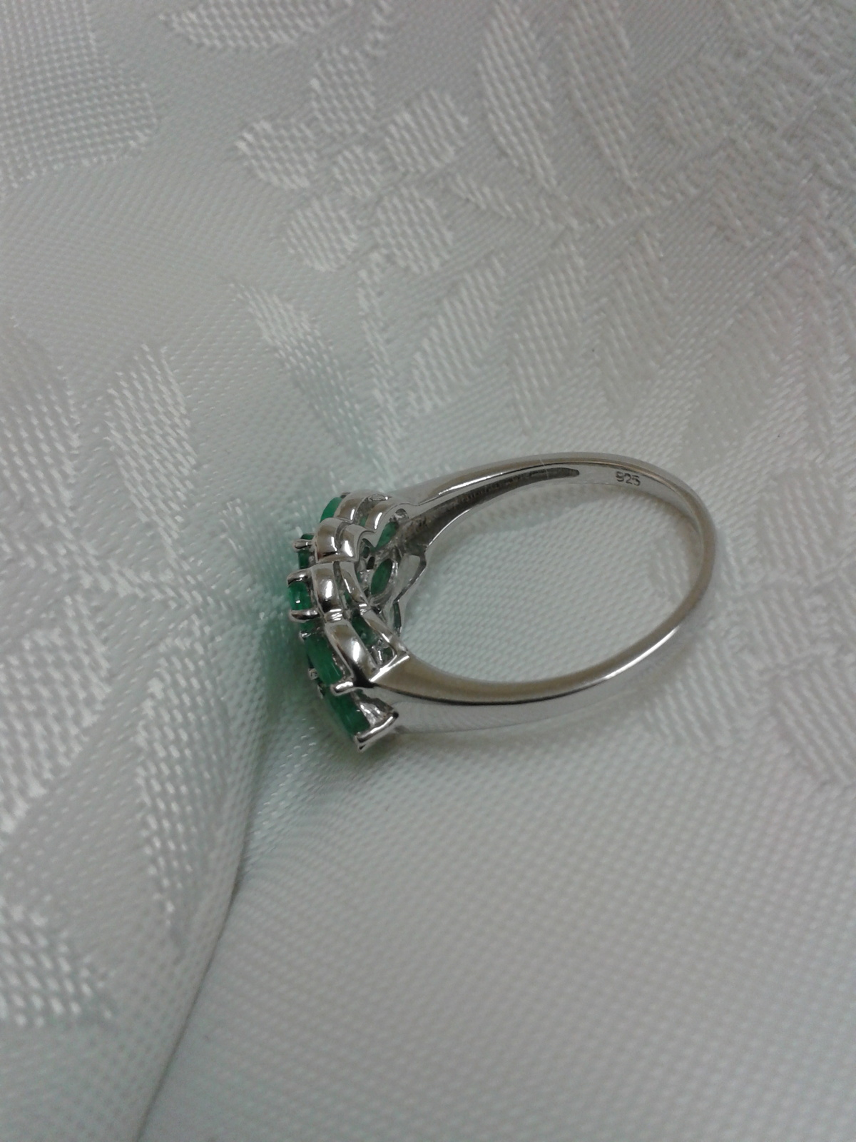 A beautiful sterling silver ring set with 13 sparkling emerald green stones .