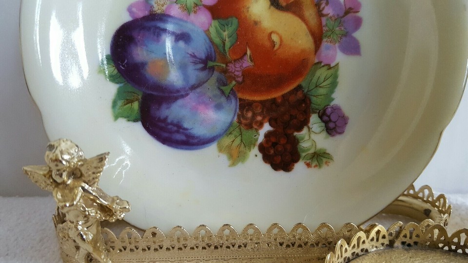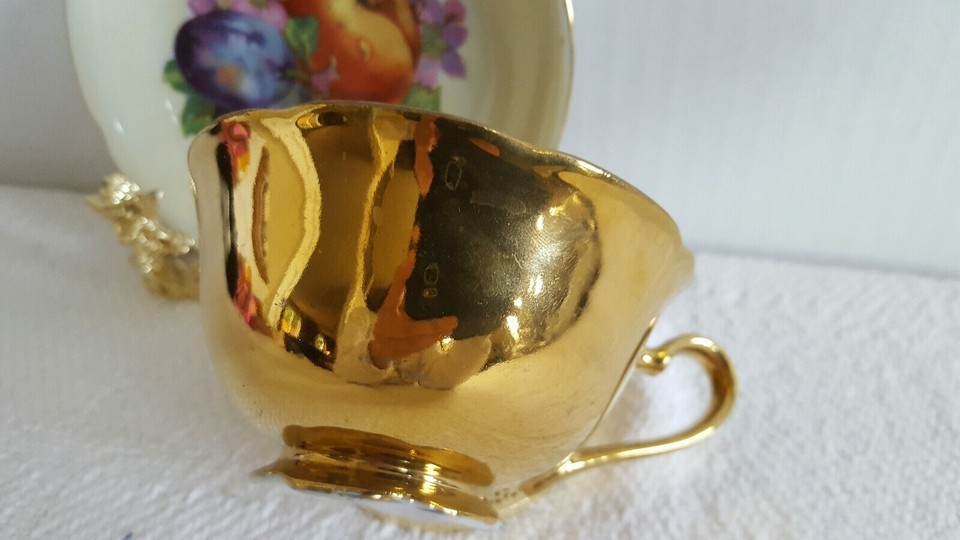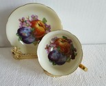 - Beautiful Vintage Saji Tea Cup and Saucer w Fruit Pattern Heavy Gold Background
