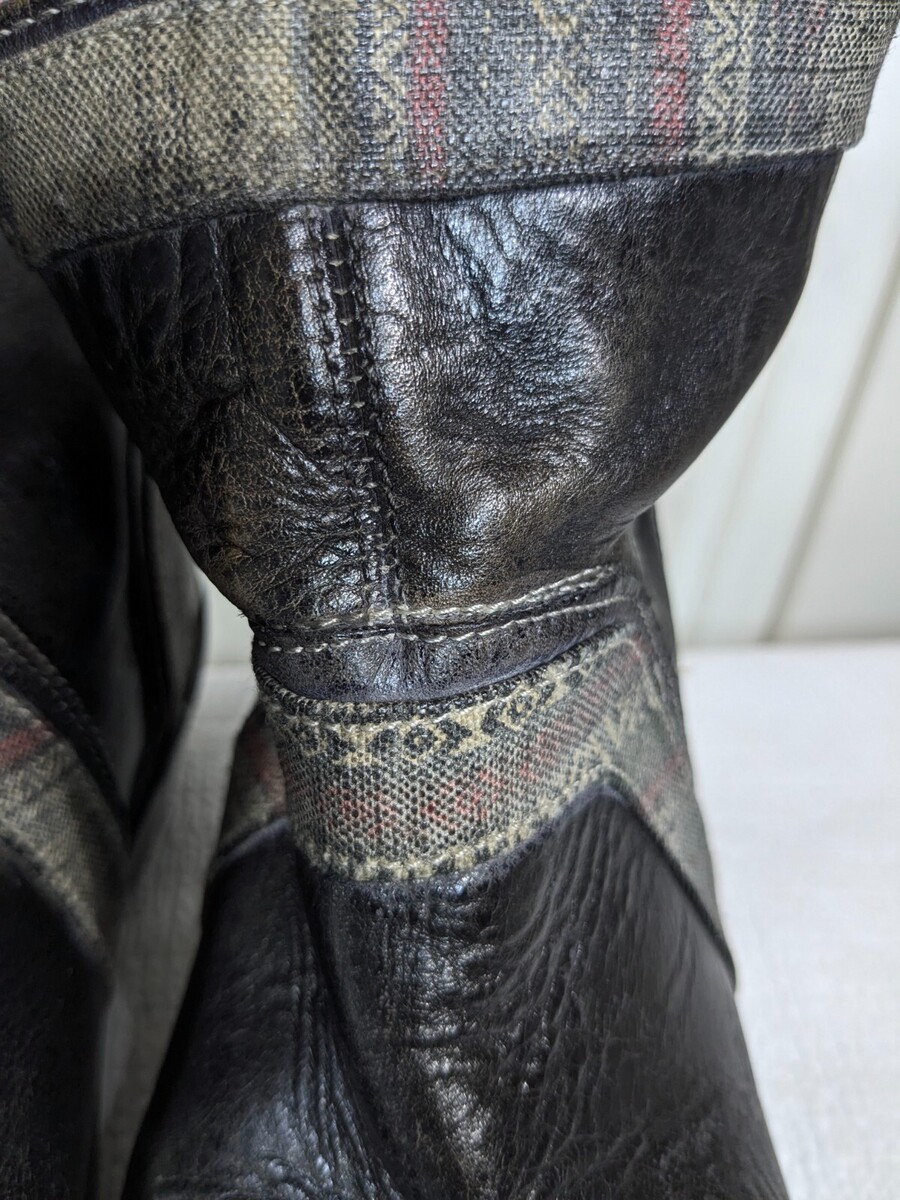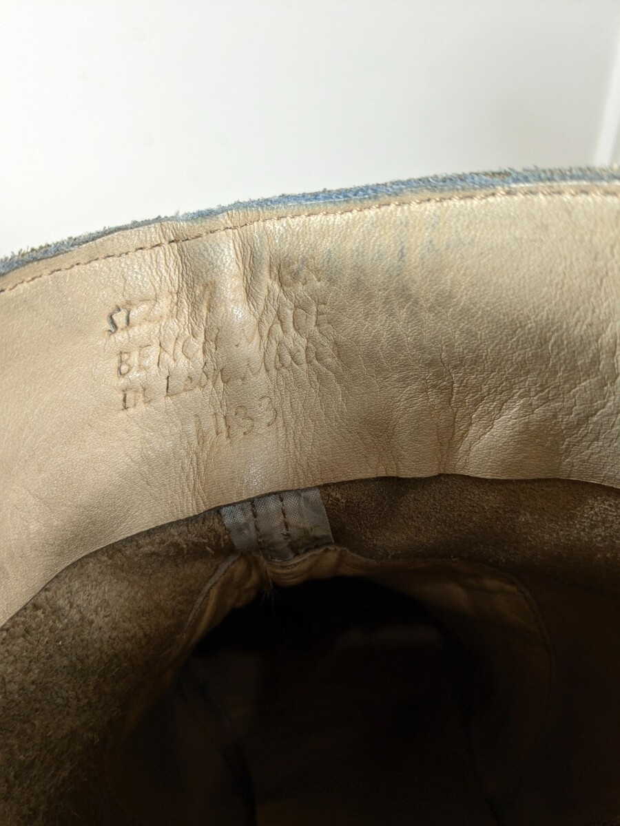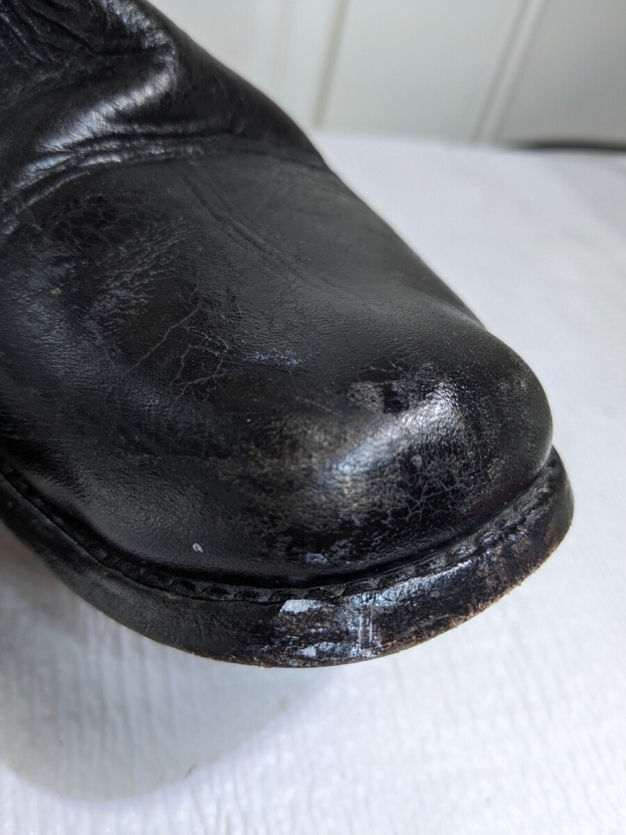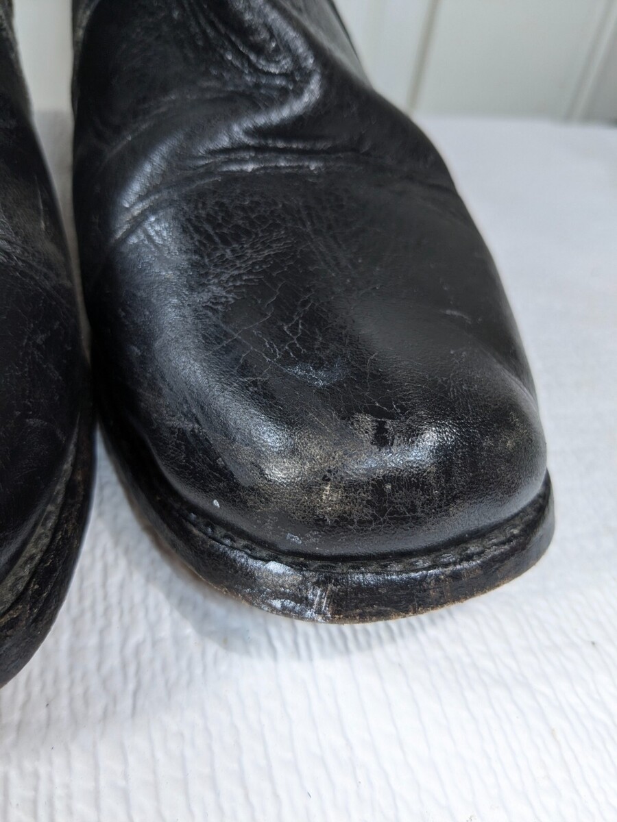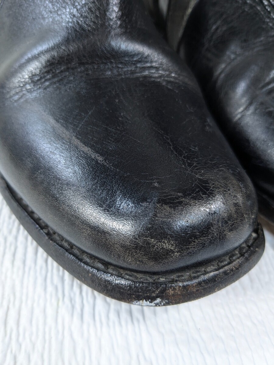 Back zipper. Leather booties with distressing. See pics for details including condition.