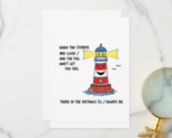Send a beacon of hope with this charming, illustrated lighthouse greeting card, perfect for offering encouragement and reminding someone you care. The lighthouse, personified with a friendly smile, sends out its beam with the message: "WHEN THE STORMS ARE CLOSE / AND THE FOG WON'T LET YOU SEE, / THERE IN THE DISTANCE I'LL / ALWAYS BE." This high-quality flat card is ideal for friends, family, or anyone going through a rough time, offering a heartfelt message of friendship, support, and a consistent presence. A wonderful all occasion greeting card that says "I'm thinking of you" when they need it most.