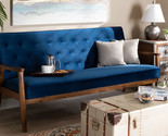 Features: Constructed from rubberwood, MDF wood, and LVL Walnut brown finish Upholstered in velvet polyester fabric and padded with foam Button tufted Angled legs Solid and Quality Construction Set Includes: One (1) Sofa