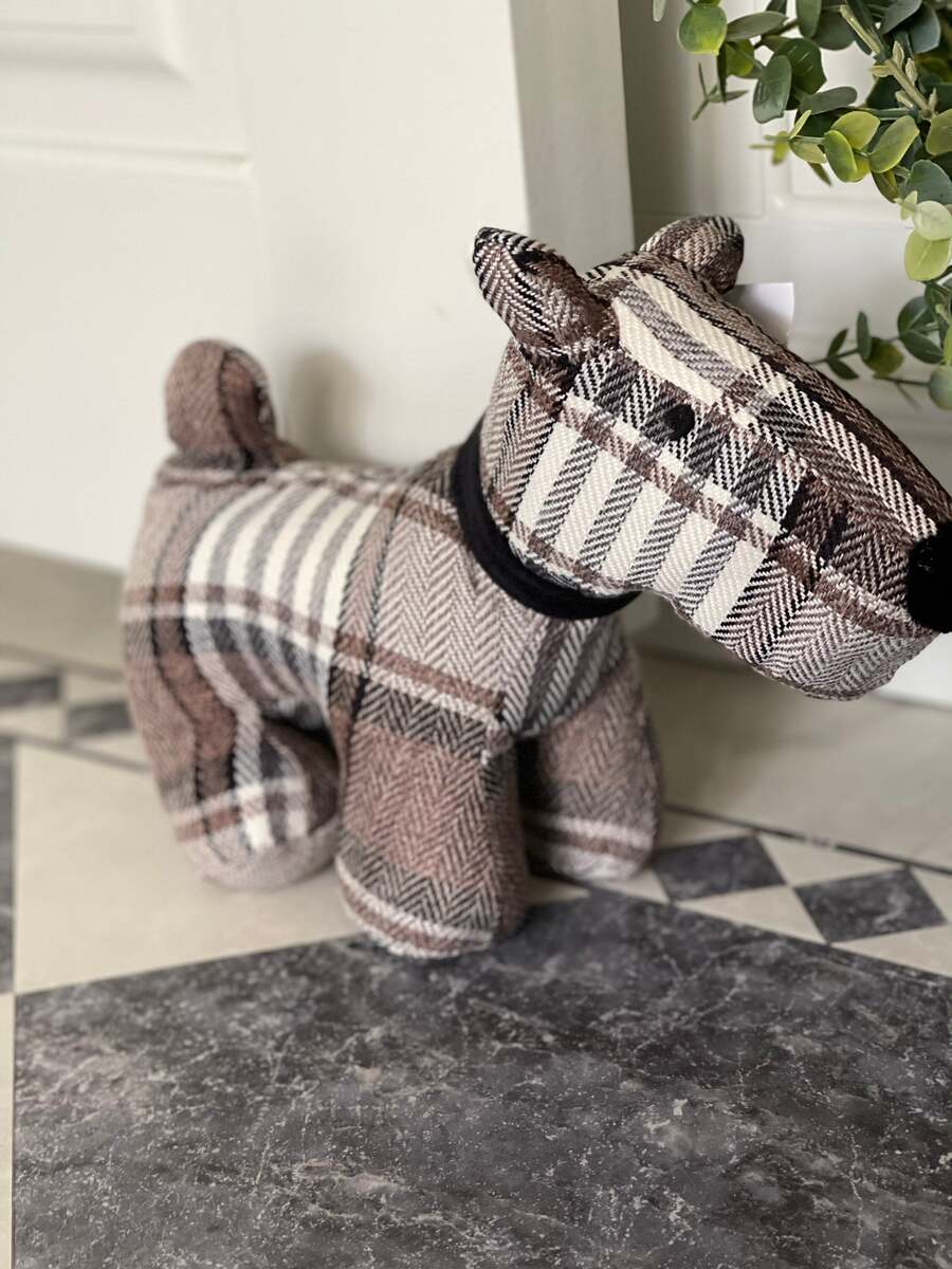 - Bentley the Dog Fabric Household Door Stop - Brown Tartan