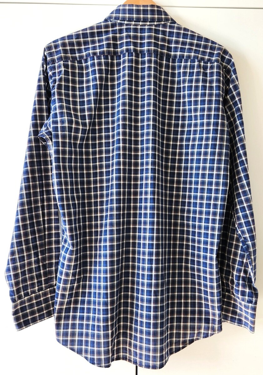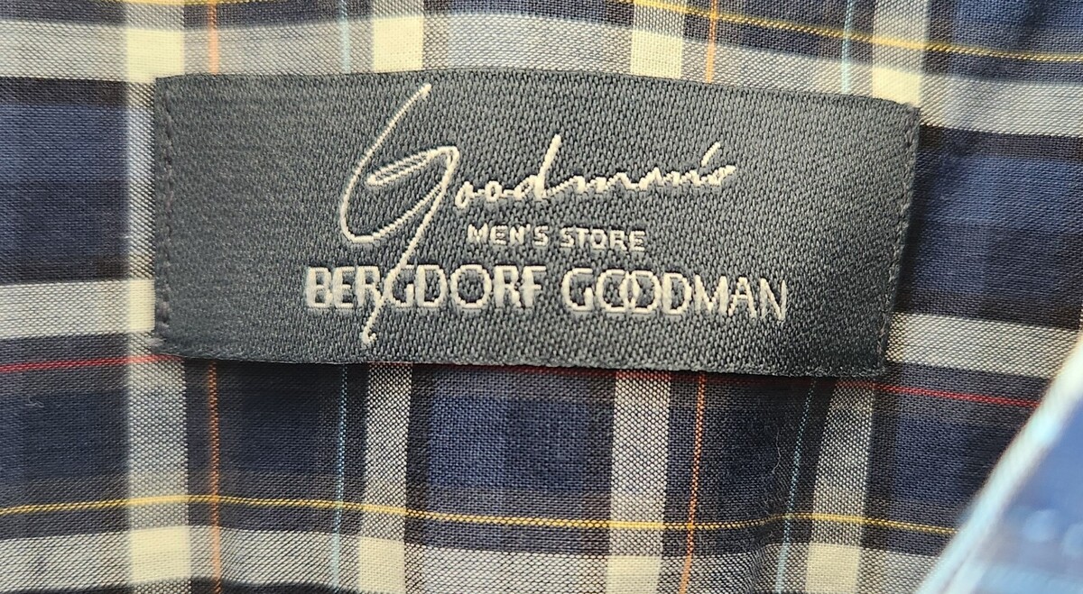 This Bergdorf Goodman, Made In Italy, dress shirt is a stylish and high-quality addition to any man's wardrobe. Made in Italy, this shirt features a classic blue color with a plaid pattern, long sleeves, and a button-up closure for a polished look.