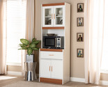 The simplicity and elegance of the Bernard kitchen cabinet and hutch is matched only by its practicality. The modern and contemporary-inspired design emphasizes a tall, rectangular silhouette and clean, solid coloring. The Bernard's engineered wood frame is charming with its two-tone white and cherry finish, complemented by light brown door and drawer handles. The hutch features a top cabinet with glass paneled doors, behind which are two shelf spaces. For even more convenience and storage possibilities, the Bernard also has two shelf spaces in the bottom cabinet, one drawer, and an open space perfect for placing a microwave, coffee maker, or other kitchen appliance. The back panel of the microwave compartment has a circular opening for cord management. This stylish, smart hutch cabinet can be easily coordinated into your kitchen or dining room, providing plenty of space for storage and display. Made in Malaysia, the Bernard requires assembly.