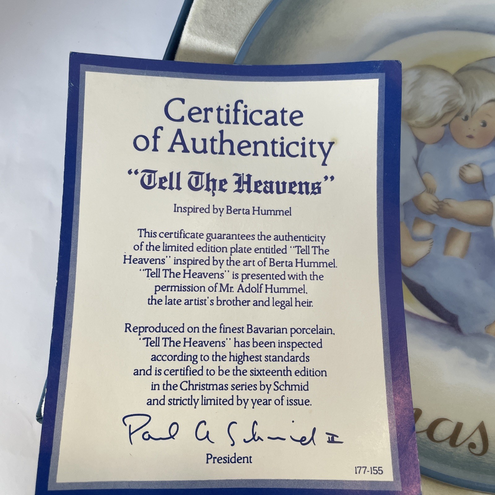 The Berta Hummel Collector Series 1986 Christmas Plate, ?Tell the Heavens?by Schmid Brothers is a high-quality porcelain plate featuring a white color scheme with a novelty style. Made in Germany, this collector's item is designed to commemorate the holiday season and is sure to be a cherished addition to any decorative collection. The intricate details and craftsmanship of this plate make it a special piece for collectors and holiday enthusiasts alike.