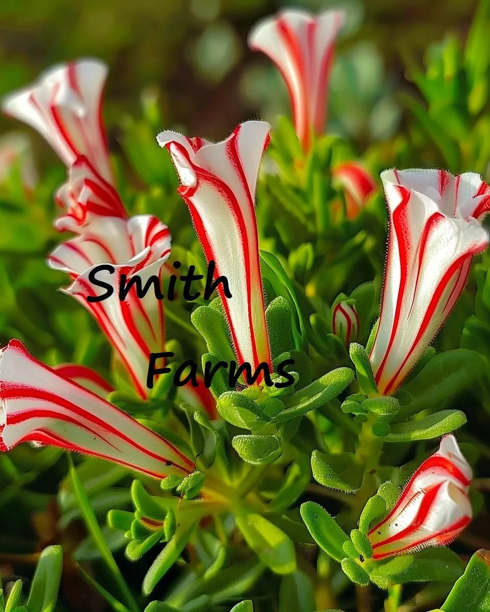 Delicate, trumpet-shaped white flowers with striking red edges, resembling candy canes, and clover-like green leaves, creating a charming and festive display!