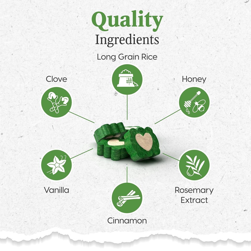 ALL NATURAL DENTAL CHEW: The patented toothpaste soft center chew fights plaque, tartar and bacteria causing bad breath with natural ingredients such as alfalfa, cinnamon, vanilla, and clove.