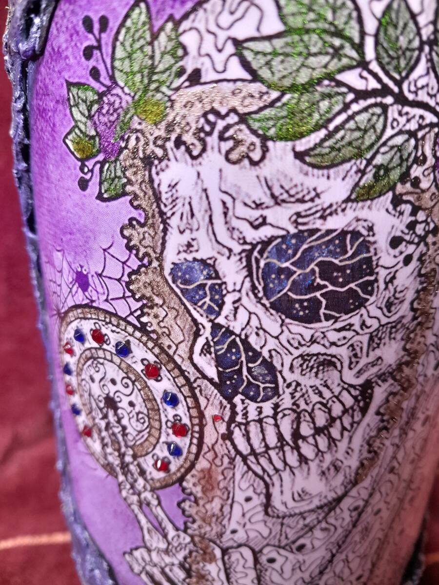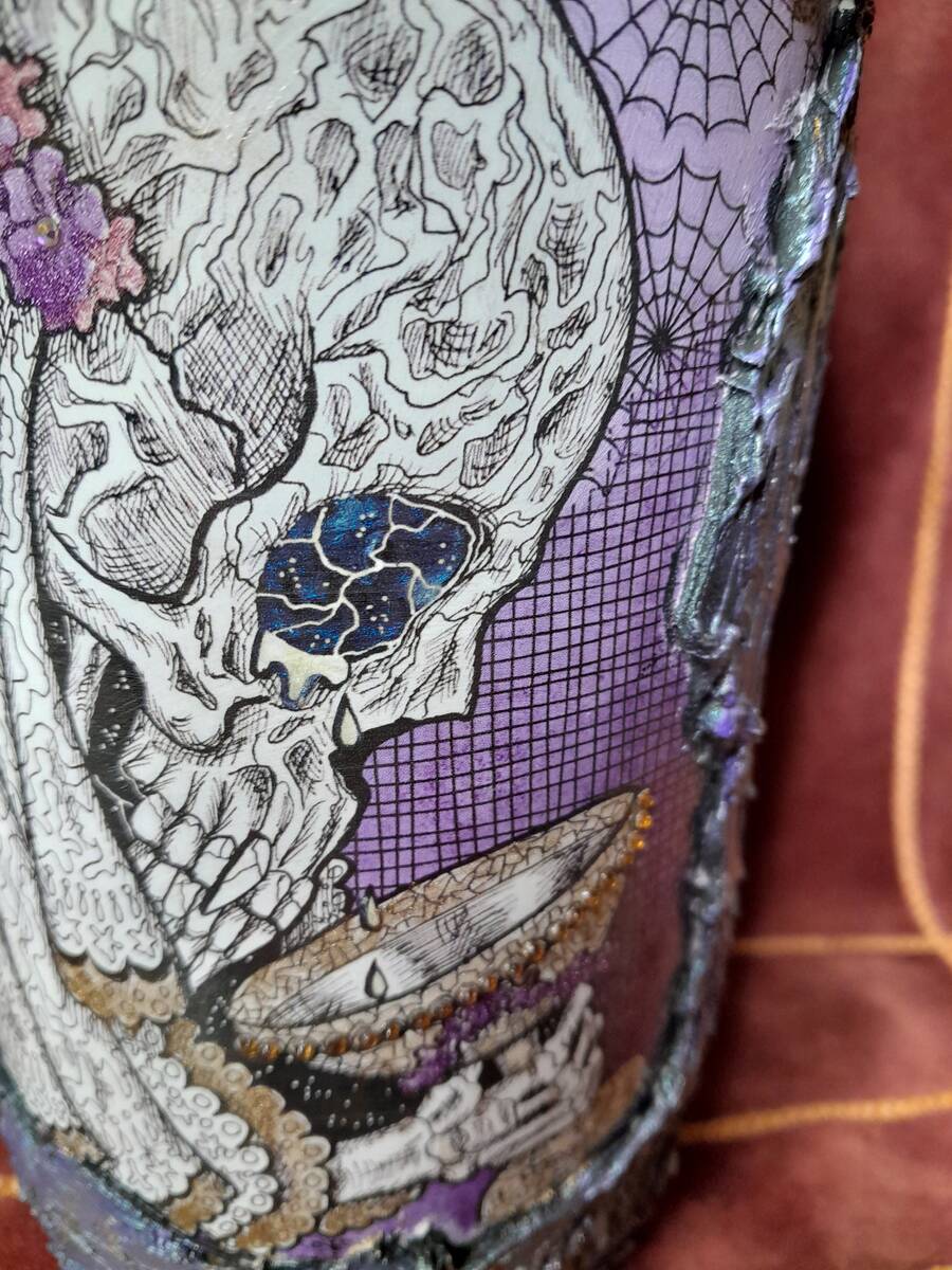 This bottle tells a story. This Corpse Bride is unlucky in love and is betting on love on one side, and crying tears into a crystal goblet on the other. A mixed media collectors item. Will make a great addition to your collection, a centerpiece, a conversation starter. Perfection for many occasions.