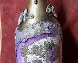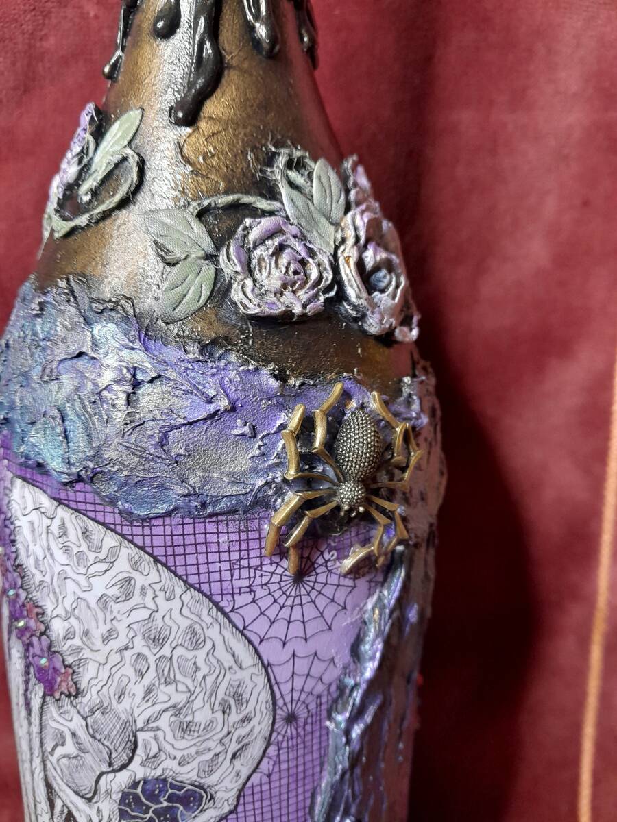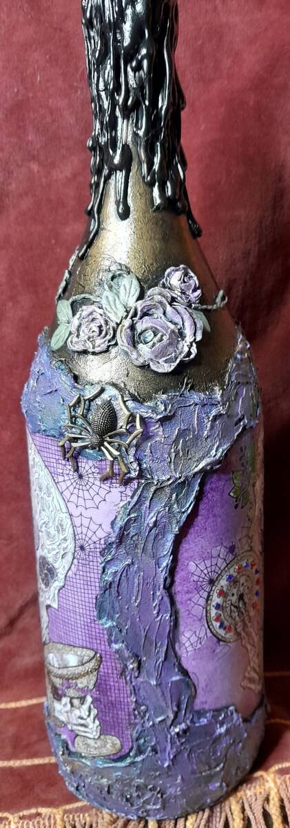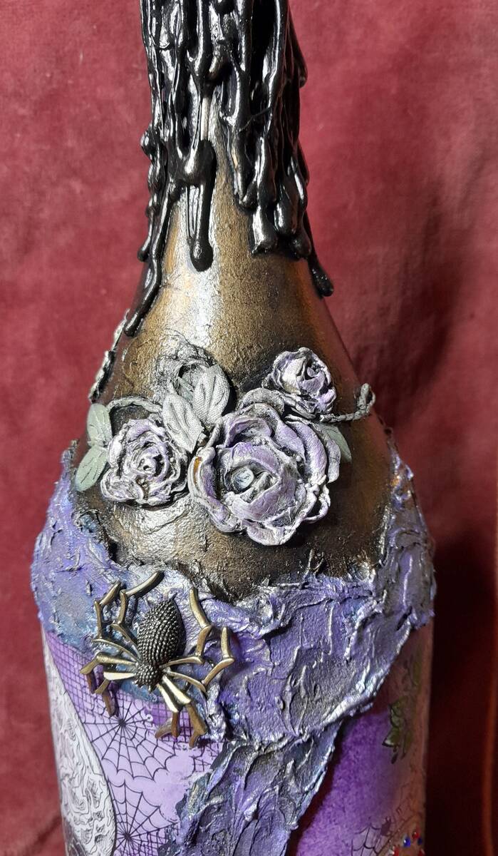 We took a large wine bottle and embellished it with texture paste, bronze spider, rhinestones, paint, glitter pigment, clay flowers, silk floral, jute twine.