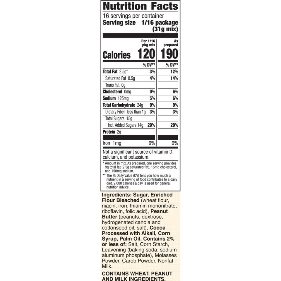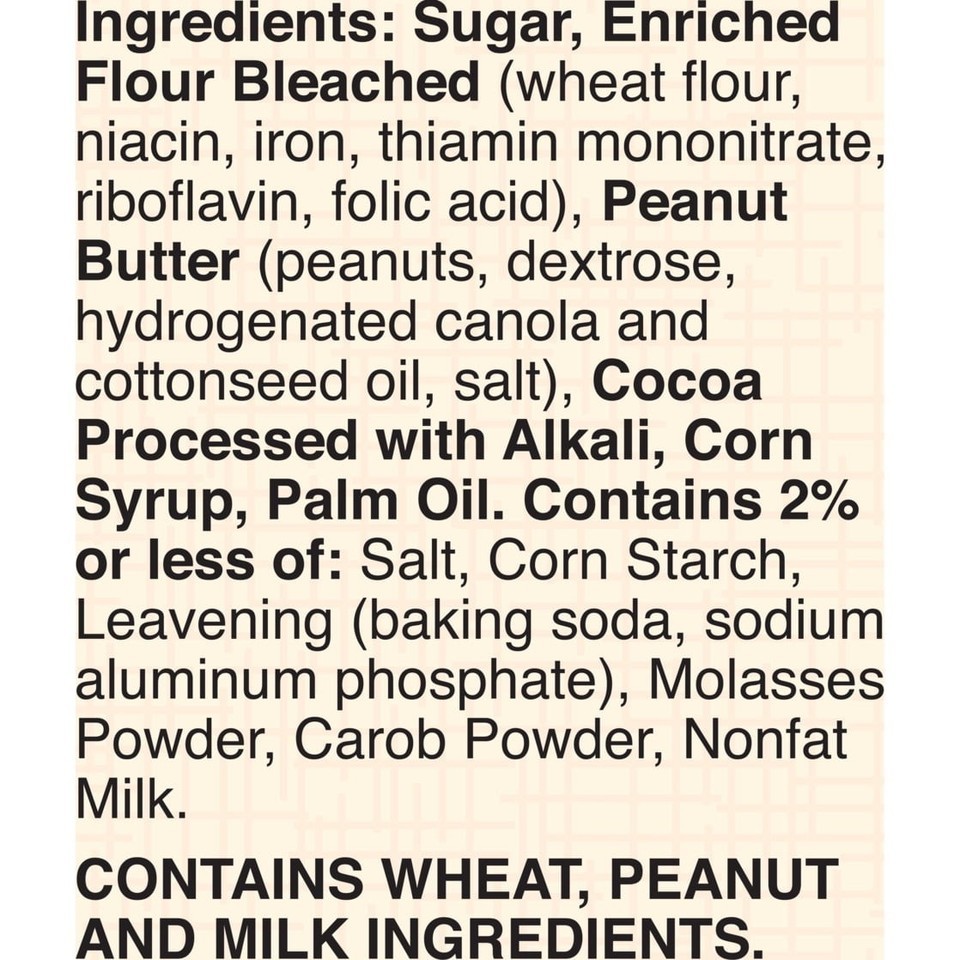 Sugar, Enriched Flour Bleached (wheat flour, niacin, iron, thiamin mononitrate, riboflavin, folic acid), Peanut Butter (peanuts, dextrose, hydrogenated canola and cottonseed oil, salt), Cocoa Processed with Alkali, Corn Syrup, Palm Oil. Contains 2% or less of: Salt, Corn Starch, Leavening (baking soda, sodium aluminum phosphate), Molasses Powder, Carob Powder, Nonfat Milk./div