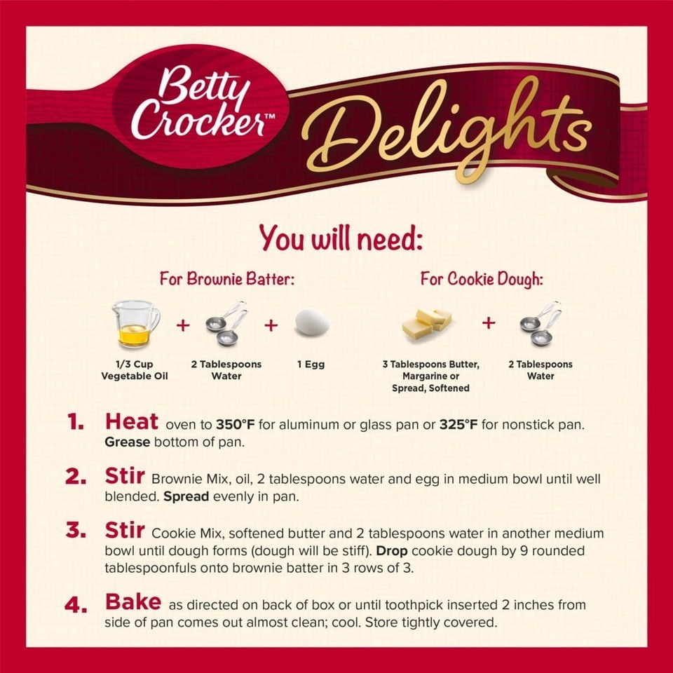 Satisfy your sweet tooth cravings with Betty Crocker Delights Peanut Butter Cookie Brownie Bars Mix. This brownie mix, combined with cookie mix, is the quick and easy way to create a delicious treat the whole family will love by adding just a few ingredients. Bite into a decadent peanut butter cookie bar mixed with chocolatey brownie in just a few simple steps. Impress friends and family at your next gathering or brighten up a Tuesday with these yummy bars. For more than a century, Betty Crocker has been a popular creator of easy, delicious recipes. Today, the Betty Crocker kitchen is still providing convenient, tasty dessert mixes, frostings, and convenient meal options and side dishes. And today, you can still find those same products you grew up with on grocery shelves.
