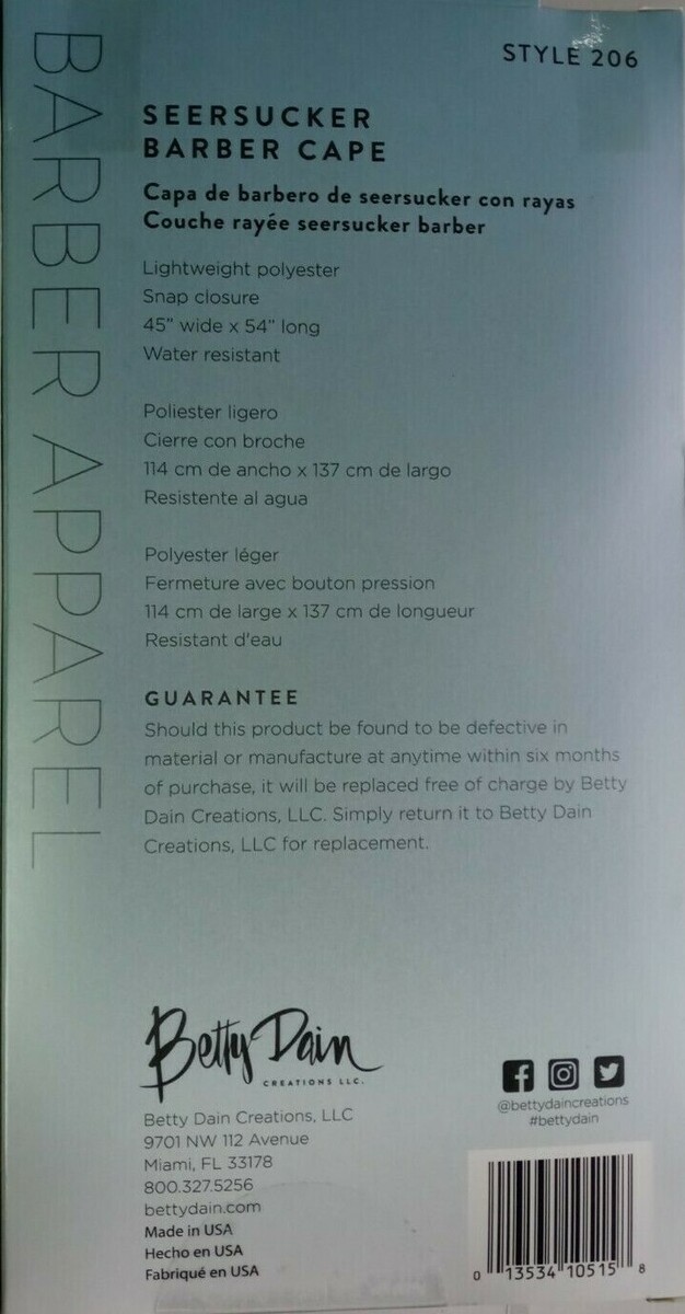 You are Buying a brand New And Factory Sealed Betty Dain 206S SEERSUCKER BARBER CLOTH BLACK 45" wide x 50" long.