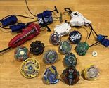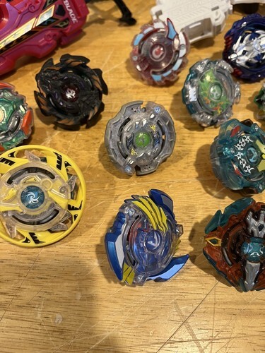 This Beyblade lot includes a variety of Takara Tomy spinning tops from the popular anime series. Featuring characters such as Blade and T.O.P, these plastic tops offer hours of fun for fans of all ages. The lot includes a mix of metal fusion and burst tops, all made in Japan and ready for battle.