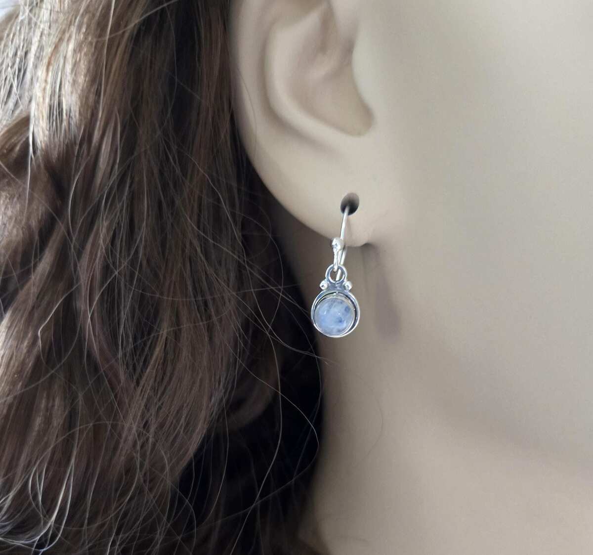 ?Style/Features: These delicate handmade moonstone dangle earrings feature luminous cabochon-cut moonstones that capture a soft, ethereal glow. Set in oxidized sterling silver bezels adorned with tiny textured balls for a subtle bohemian flair. Each pair is made by hand, pairing premium sterling silver moonstone charms with sterling silver ear wires. Perfect for everyday elegance or giving. They arrive presented on a branded earring card tucked into a crisp white box, ready to wear now or add ribbon or bow for a thoughtful gift.