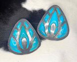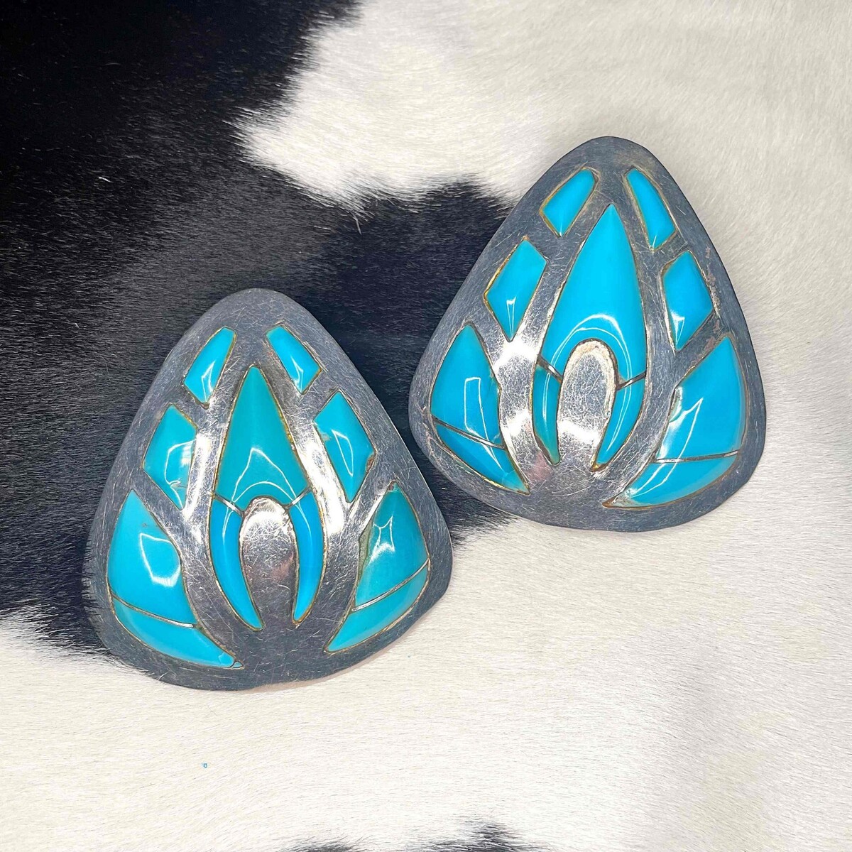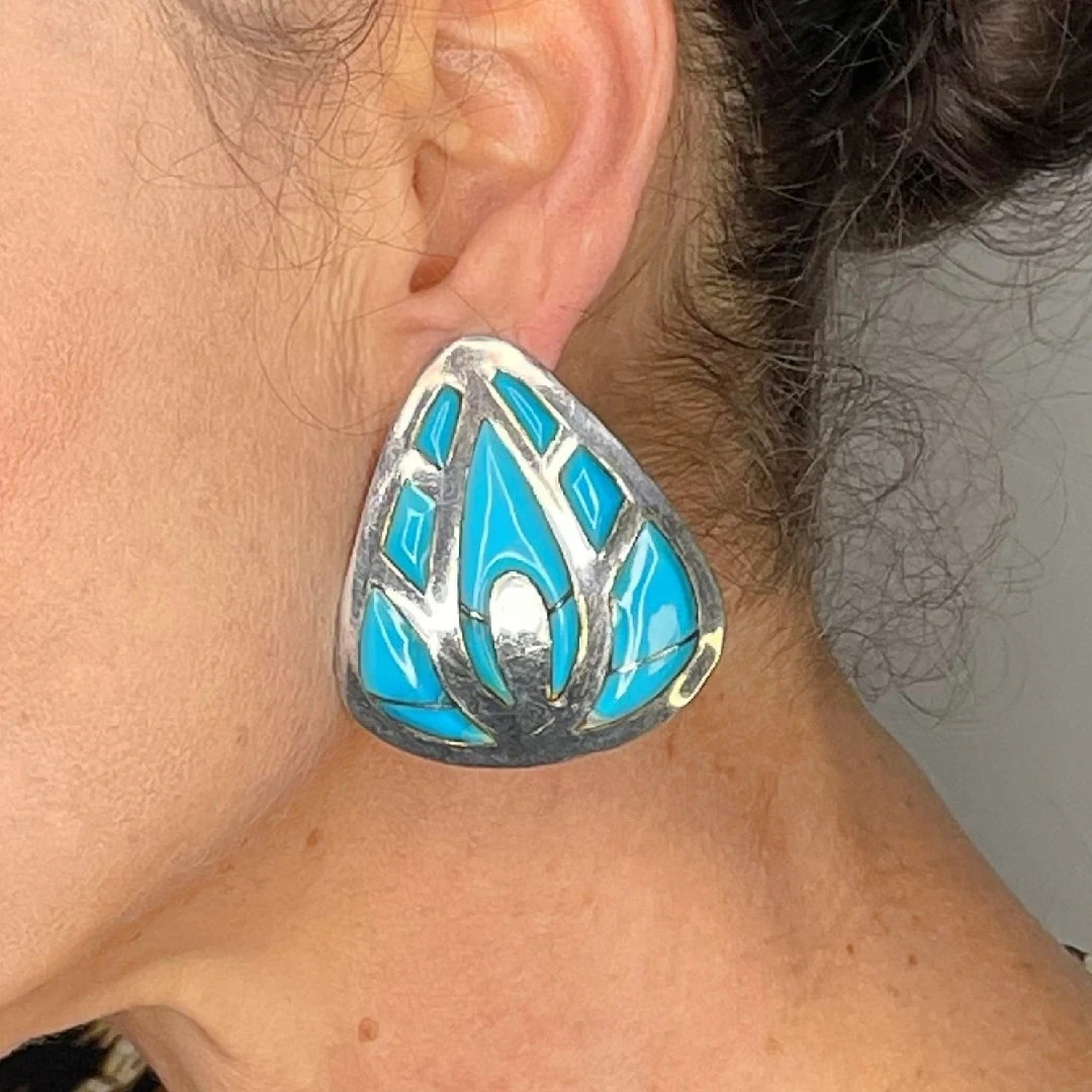 A one of a kind pair of large Native American hand crafted sterling silver earrings inlaid with exceptional natural turquoise hand cut cabochons.