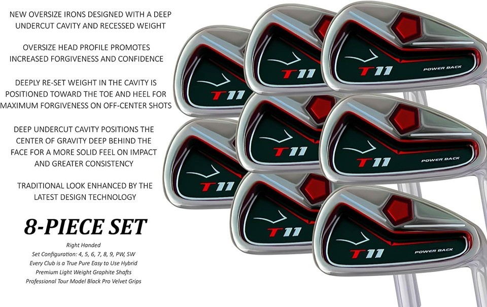 The Power Back T11 oversize irons are designed with a deeply undercut cavity and a recessed weight that moves the center of gravity farther behind the face for optimal launch angles with enhanced forgiveness. The Power Back T11 irons have a traditional look with all the enhancements of the latest technology. Golfers can make a swing that puts the ball where he wants with the confidence the Power Back T11 irons give him.