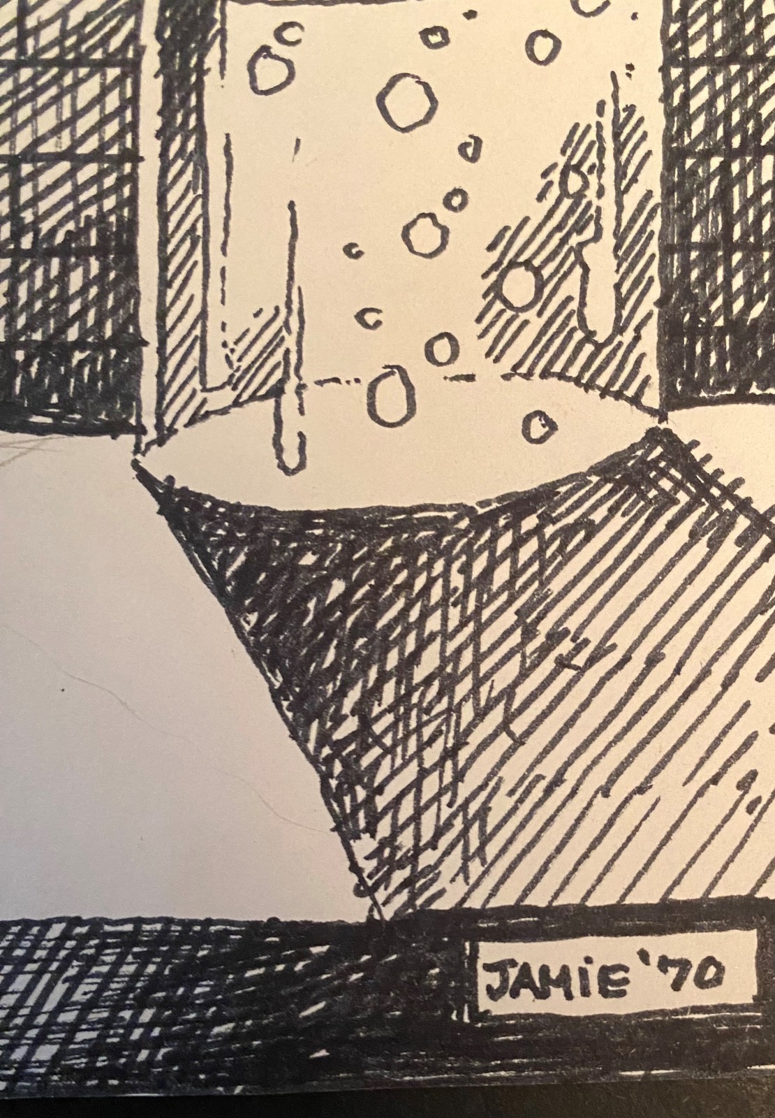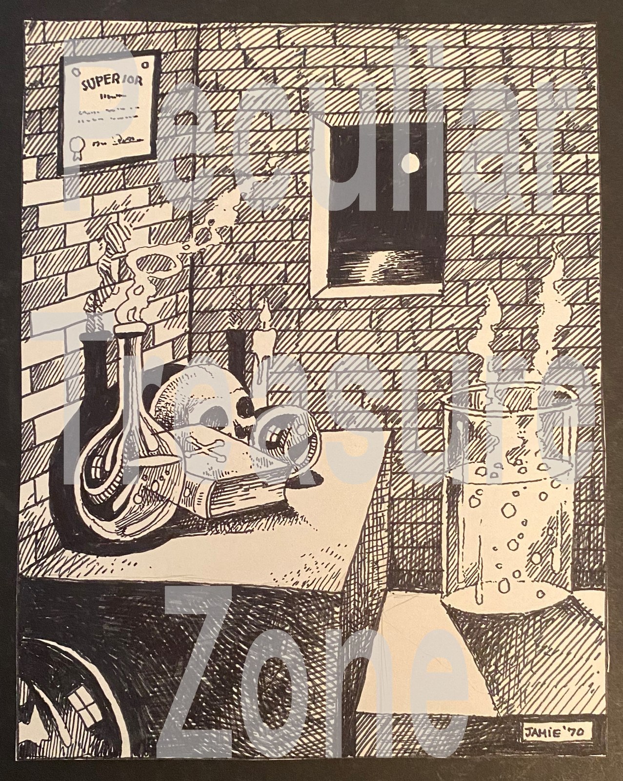 We love this drawing! Reminds us of something you'd see in a movie with a Mad scientist in it with so many well done details. What's with the framed certificate that says 'Superior' on the wall? We'll likely never know since Mr. Jameson has gone on. Please remember that most of these drawings are smaller being around 8 To 11 inches tall and 7 to 8 inches wide. They'd be perfect to frame and put in that special look at me space.