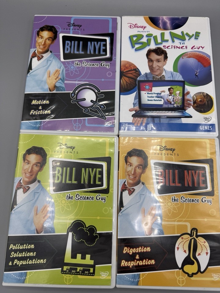 Lot of 4 Disney Presents Bill Nye the Science Guy DVDs. Genes, Digestion and Respiration, Motion and Friction, Pollution Solutions Populations. Three discs are clean and one has light scuffs. See pictures. Shipped Media Mail.
