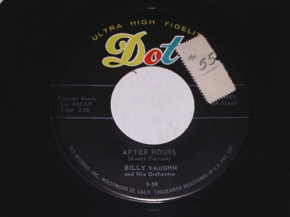 This is a vintage 45 rpm phonograph record by Billy Vaughn entitled, "After Hours". Flipside: "It's No Sin". Record Label: Dot 45-15993.