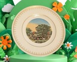 The Bing Grondahl Currier Ives Danbury Mint American Autumn In New England 759 collector plate depicts scenes of Americana in a decorative style, featuring gold trim and vibrant colors such as green, purple, brown, and blue. Made of porcelain and produced as art pottery in Denmark, this 8" round plate is part of the Currier Ives series by Danbury Mint, weighing 11 oz. This vintage piece captures the essence of American culture and would make a beautiful addition to any collector's display.