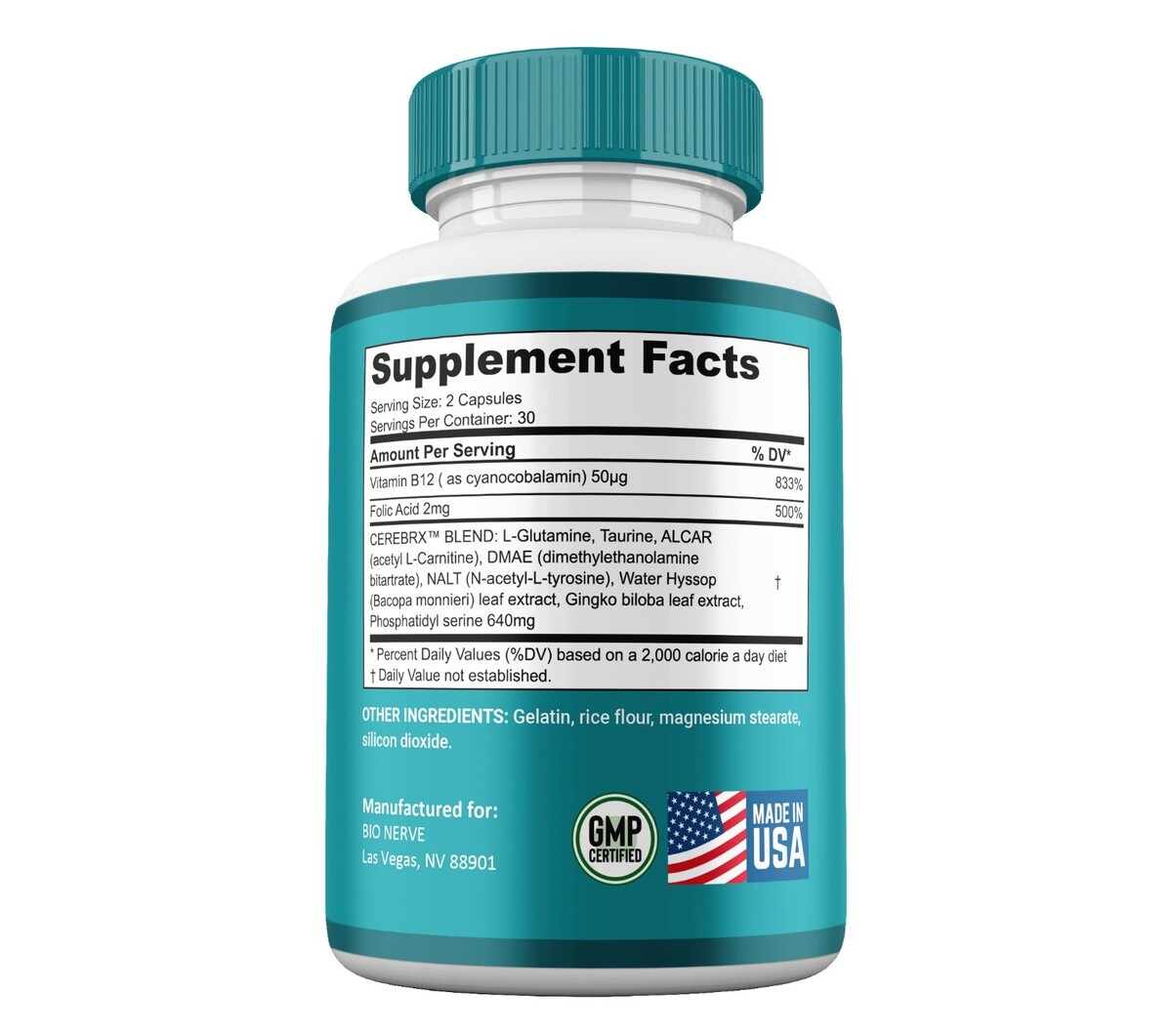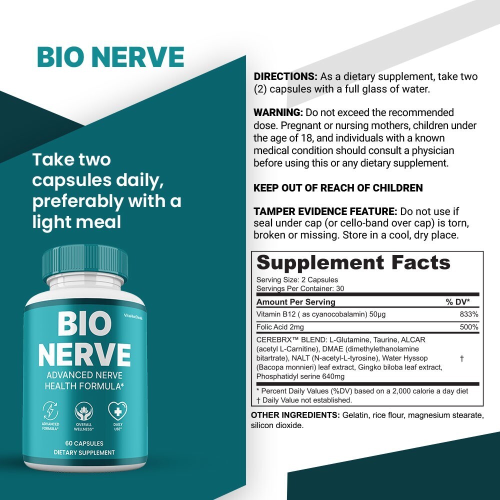 BioNerve Capsules. Each serving blends Vitamin B12 and Folic Acid for a refreshing sense of clarity and balance that helps your body and mind move with ease. Just two capsules a day make it simple to keep your routine light and steady. With 60 capsules per bottle, BioNerve is designed for both men and women who want to care for their nerve and brain wellness naturally.